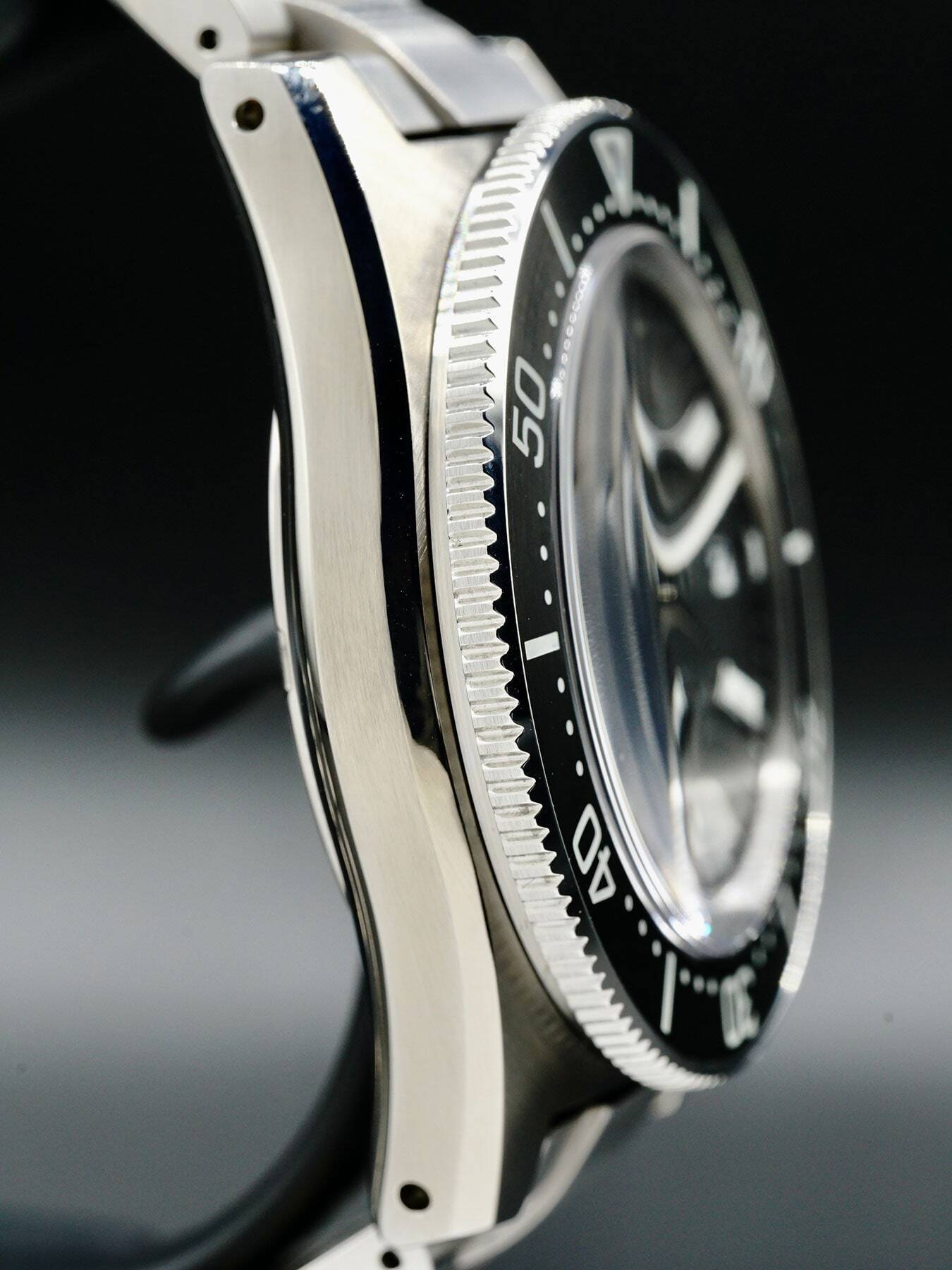 This Seiko Prospex features a 40.5mm stainless steel case with super-hard coating and a solid case back on a stainless steel bracelet. This watch also showcases a black charcoal dial with luminous hands and dial markers covered by anti-reflective sapphire crystal.