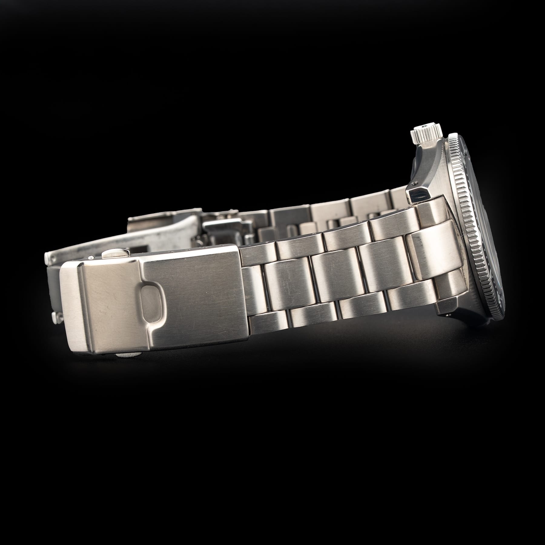 - This timepiece features a 40mm steel case paired with a high quality steel bracelet. It showcases a distinctive black dial and is powered by a precise automatic winding movement. The watch is designed with a water resistance of up to 200m.