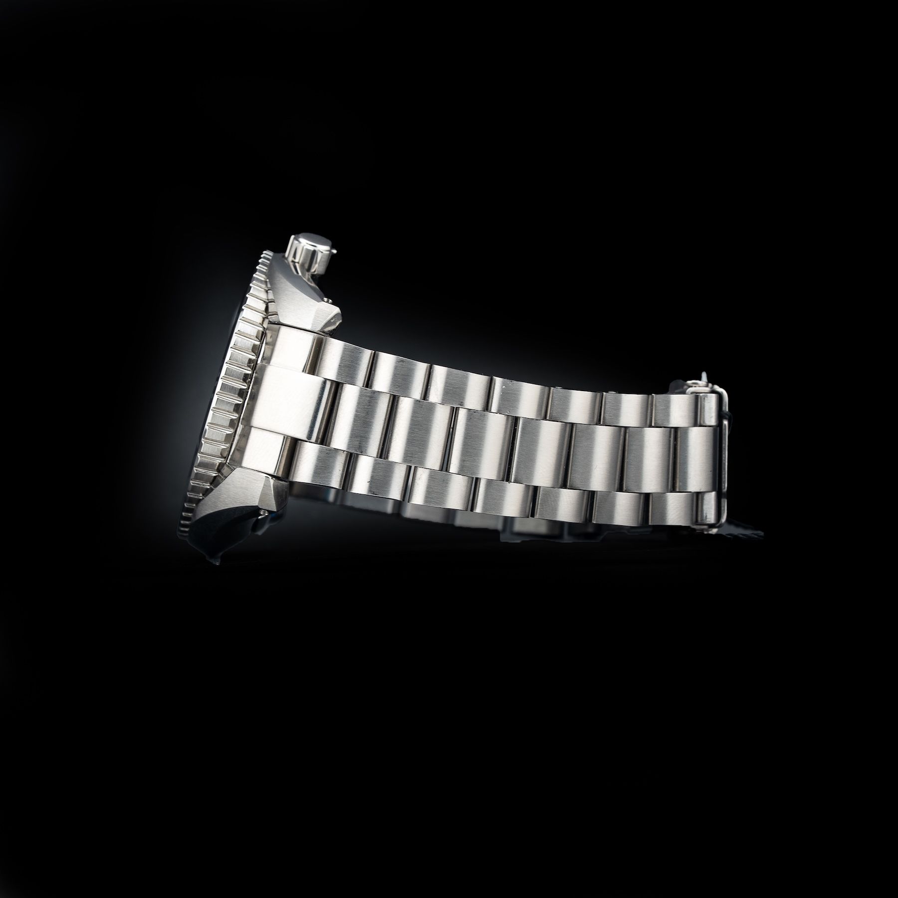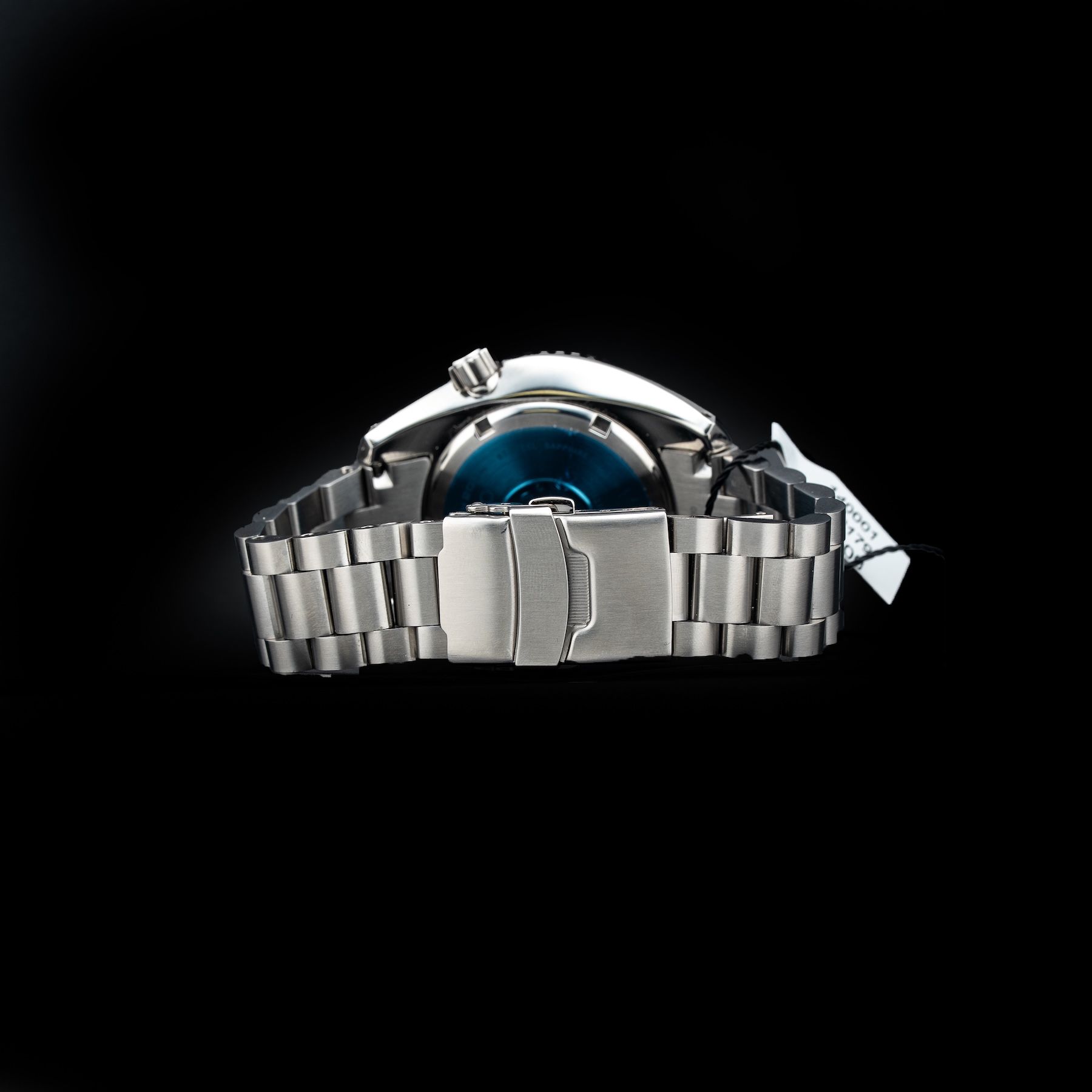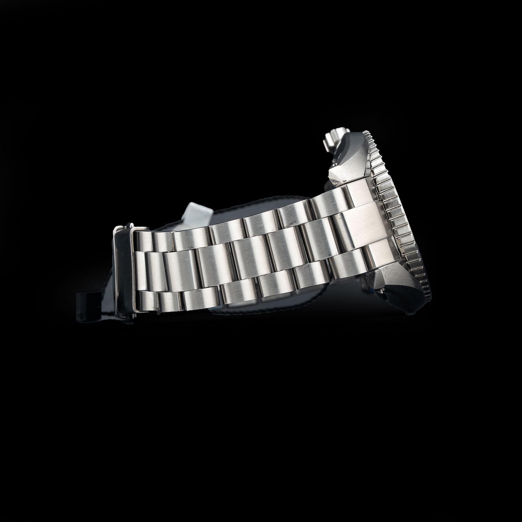 This watch features a 45mm stainless steel case on stainless steel bracelet. This watch also sports a blue dial. Powered by a mechanical automatic movement. Water resistance up to 200 meters.