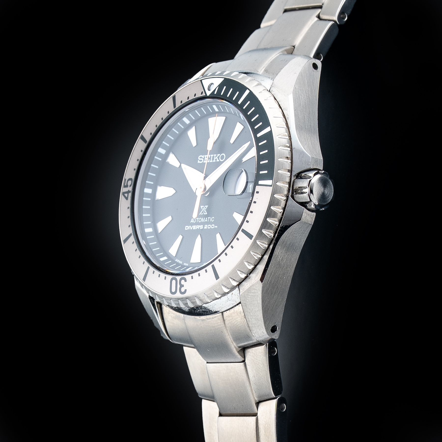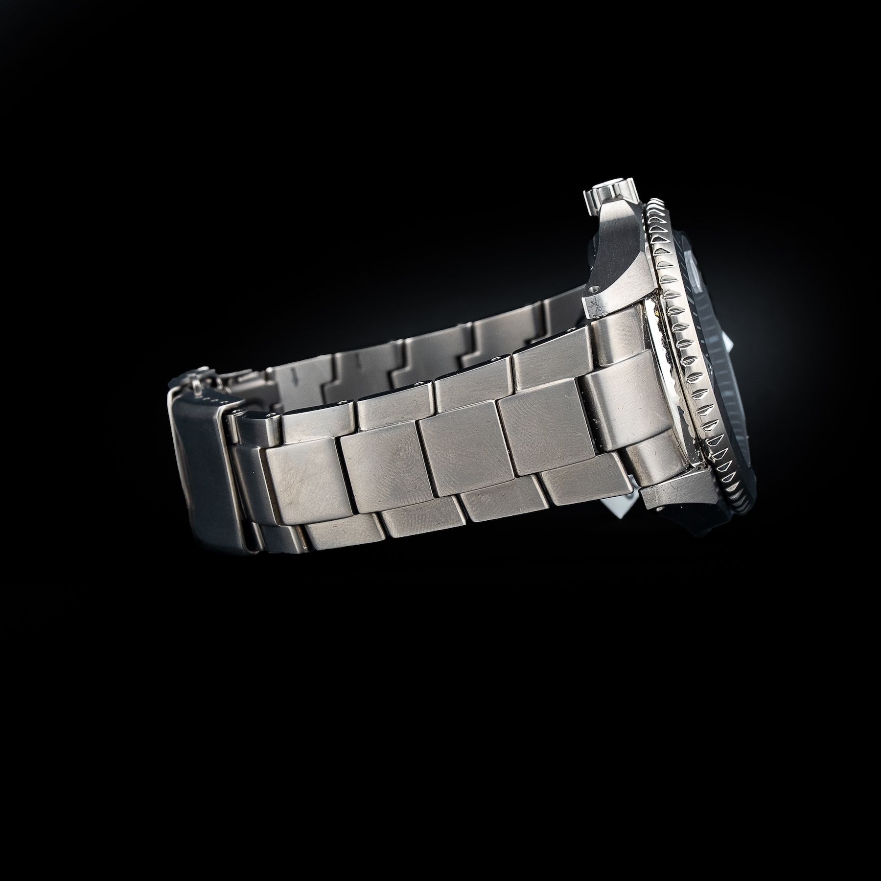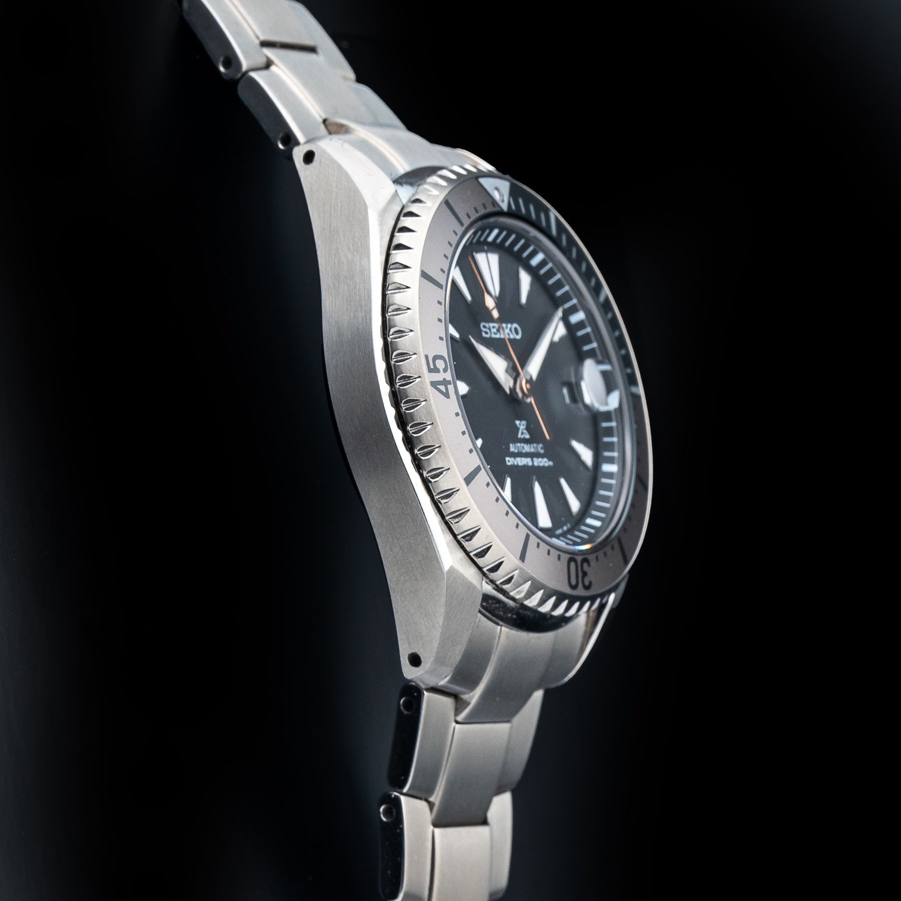 This watch features a 43mm titanium case on titanium bracelet. This watch also sports a black dial. Powered by a mechanical automatic movement. Water resistance up to 200 meters.
