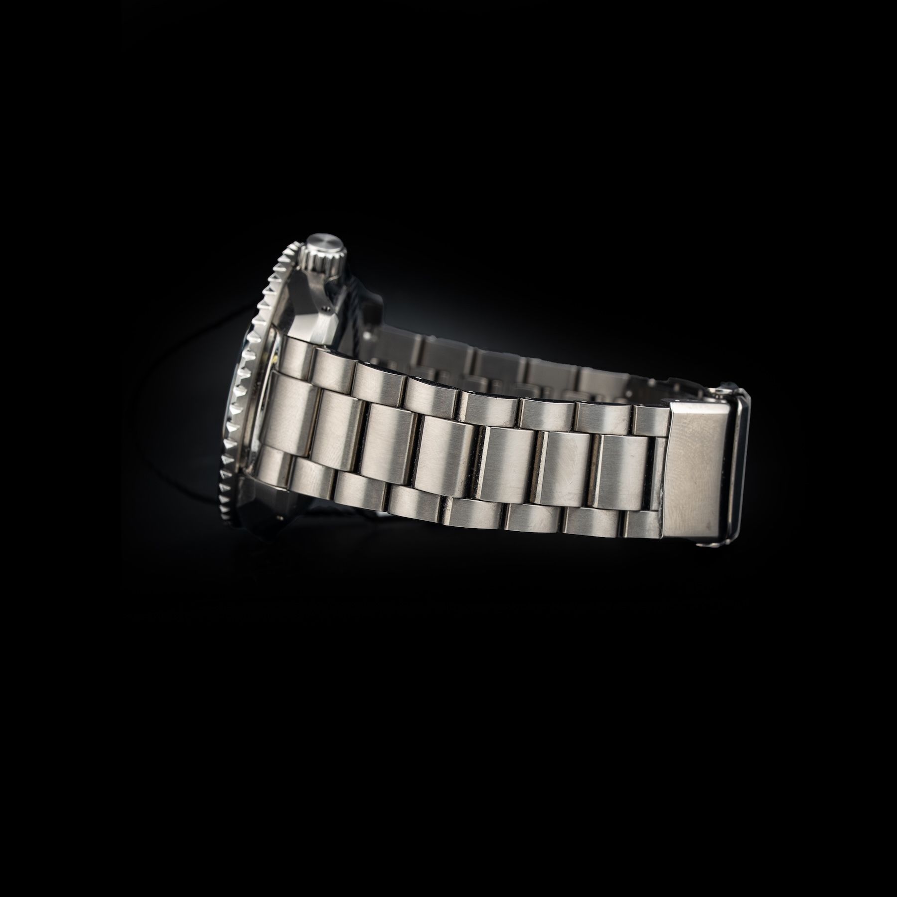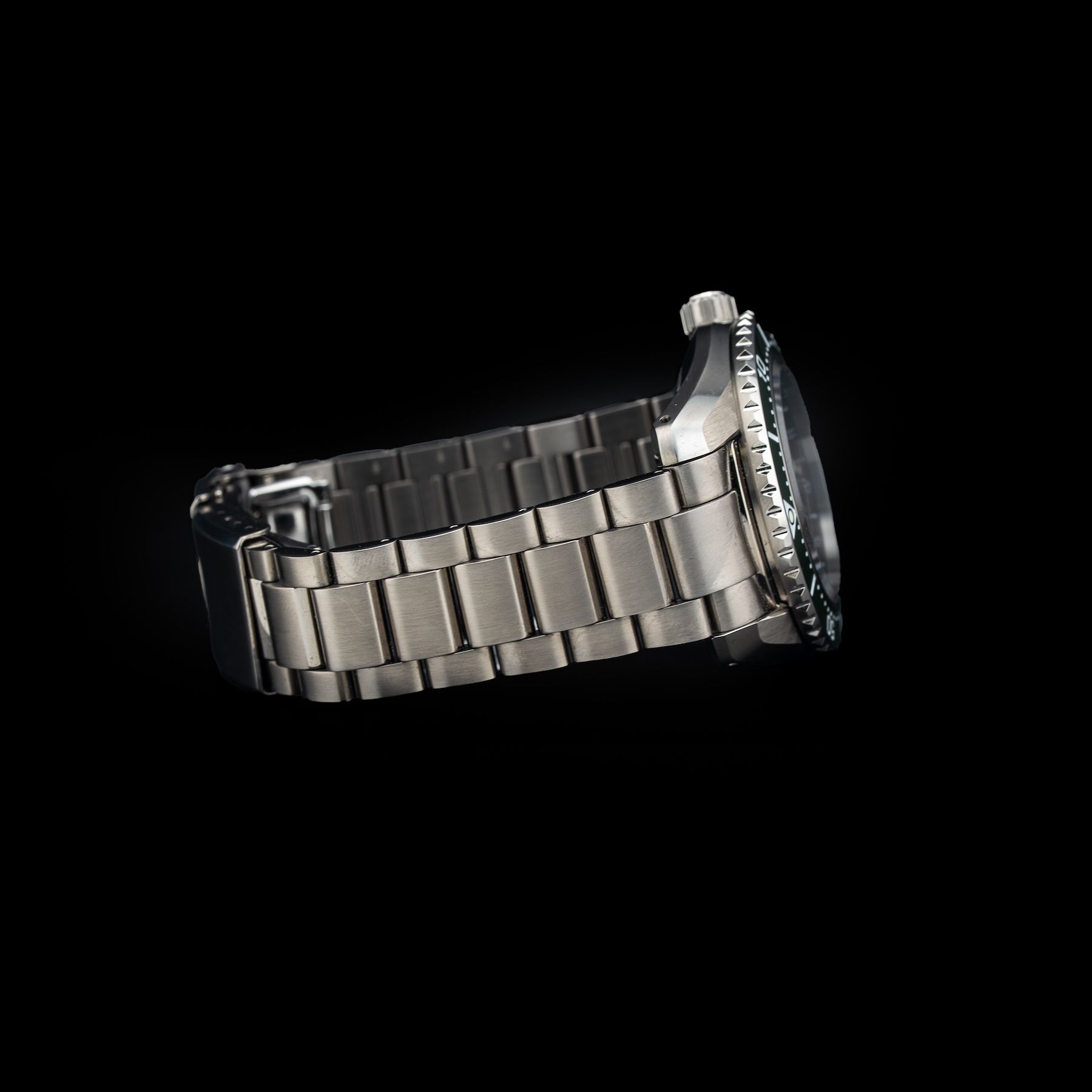 This watch features a 42mm stainless steel case on stainless steel bracelet. This watch also sports a green dial. Powered by a mechanical automatic movement. Water resistance up to 200 meters.