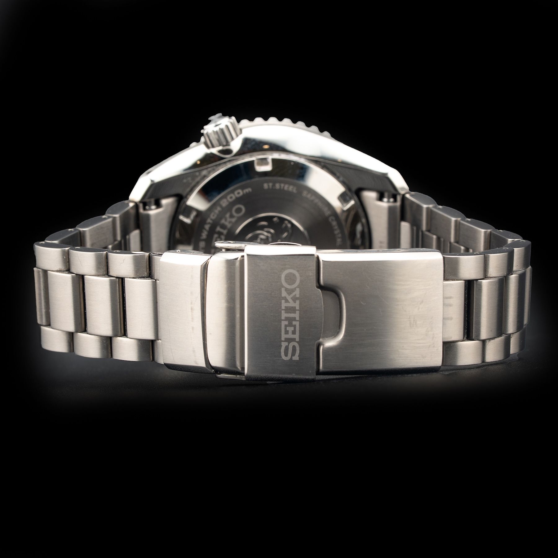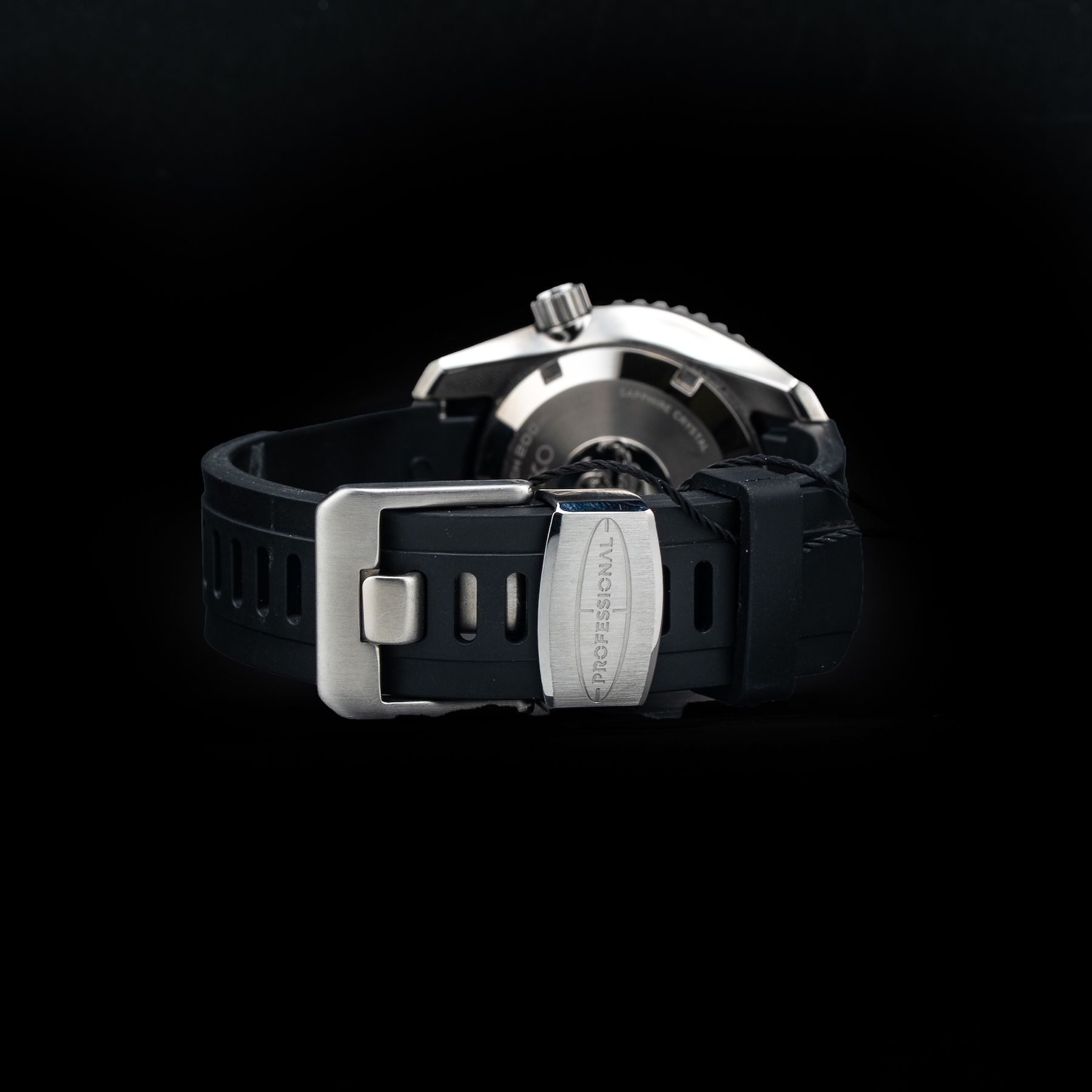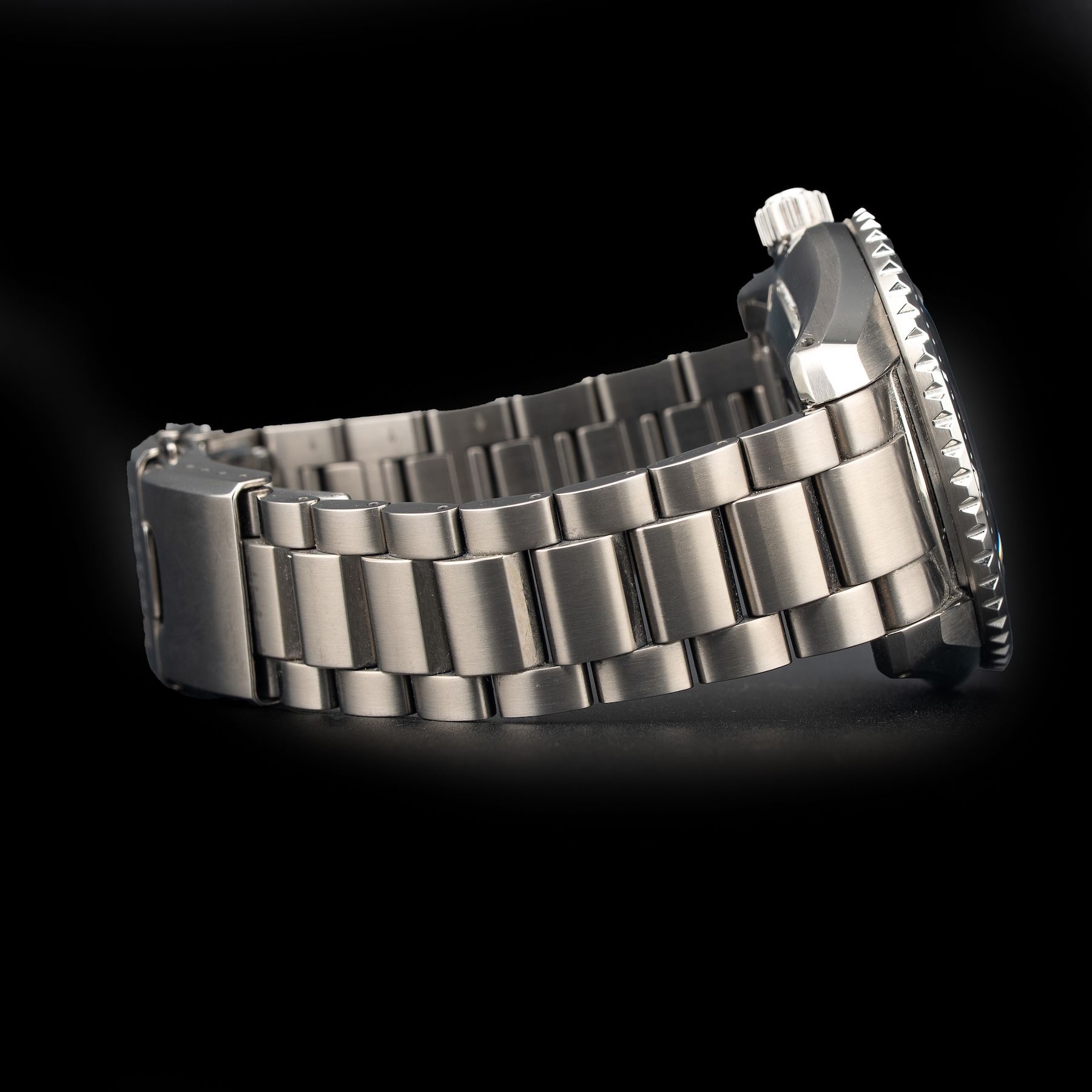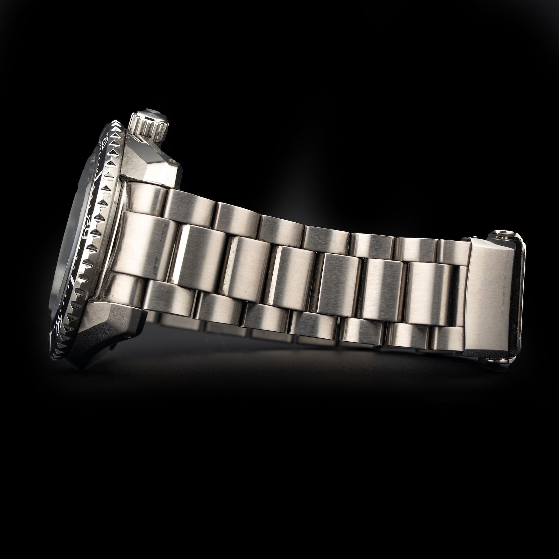This watch features a 42mm stainless steel case on stainless steel bracelet. This watch also sports a black dial. Powered by a mechanical automatic movement. Water resistance up to 200 meters.