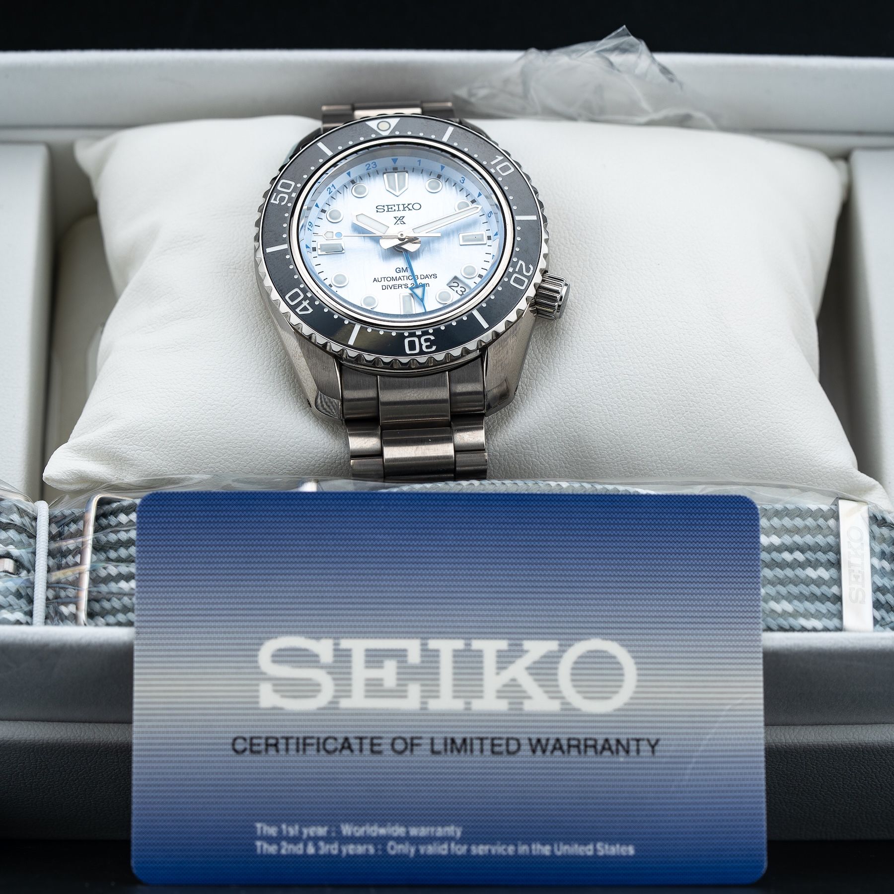 This Seiko Prospex SPB385 1968 Diver’s Modern Re-Interpretation GMT Limited Edition is in GREAT condition. This watch includes its Original Box, Original Papers and Warranty Card Dated 08/11/2023. This watch has been fully authenticated and certified by Exquisite Timepieces. Please note, the photos shown are of the actual watch you will receive.