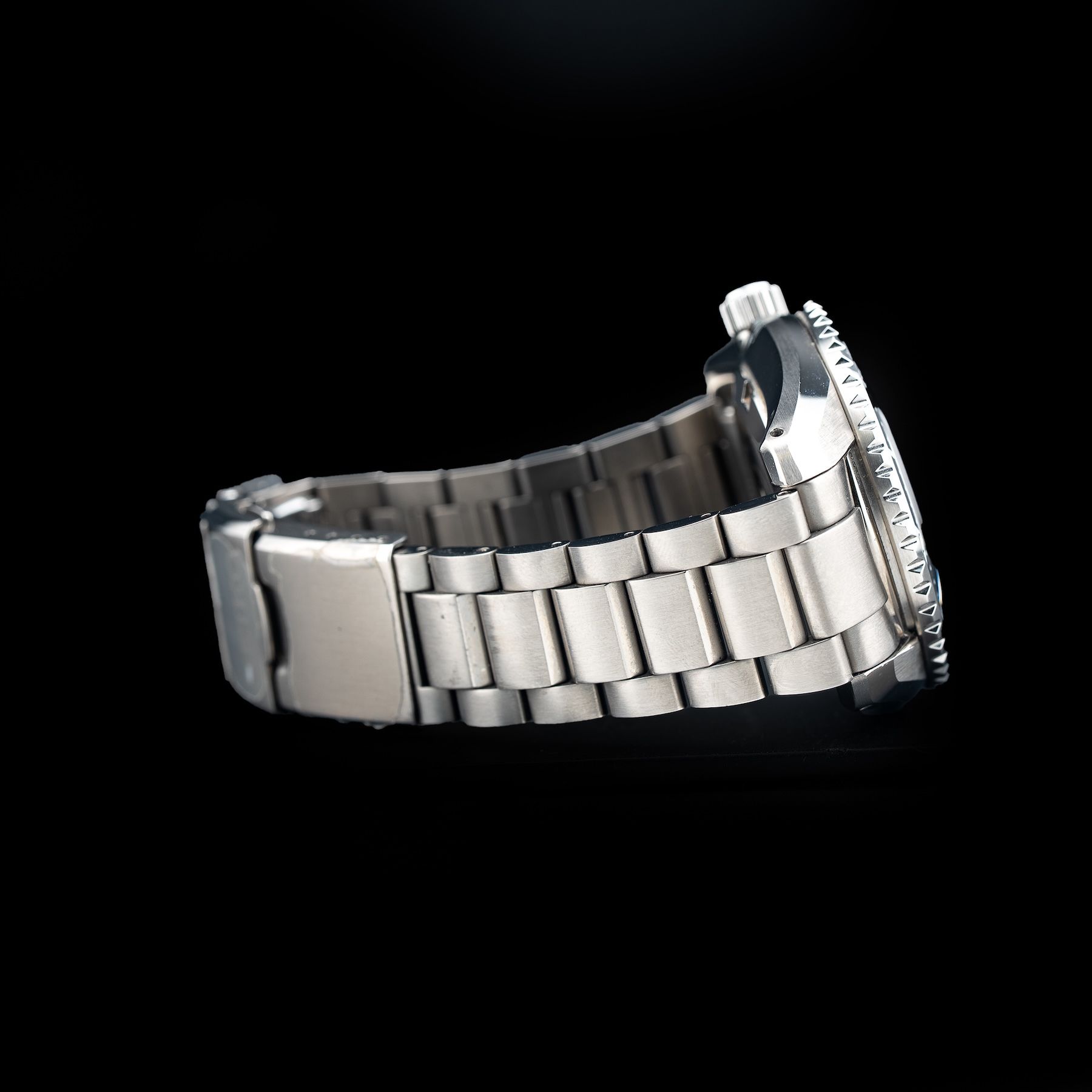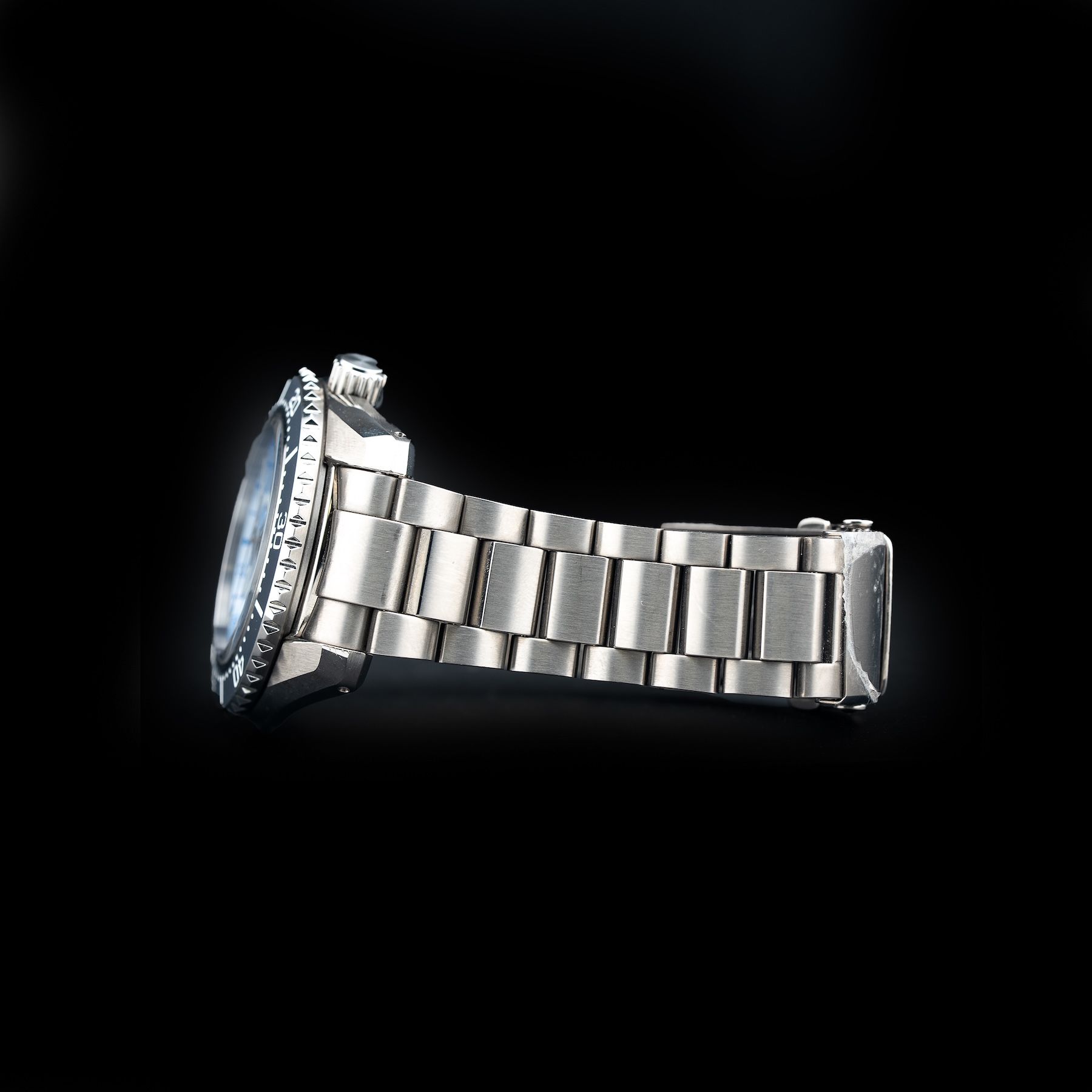 This watch features a 42mm stainless steel case on stainless steel bracelet. This watch also sports a blue dial. Powered by a mechanical automatic movement. Water resistance up to 200 meters.