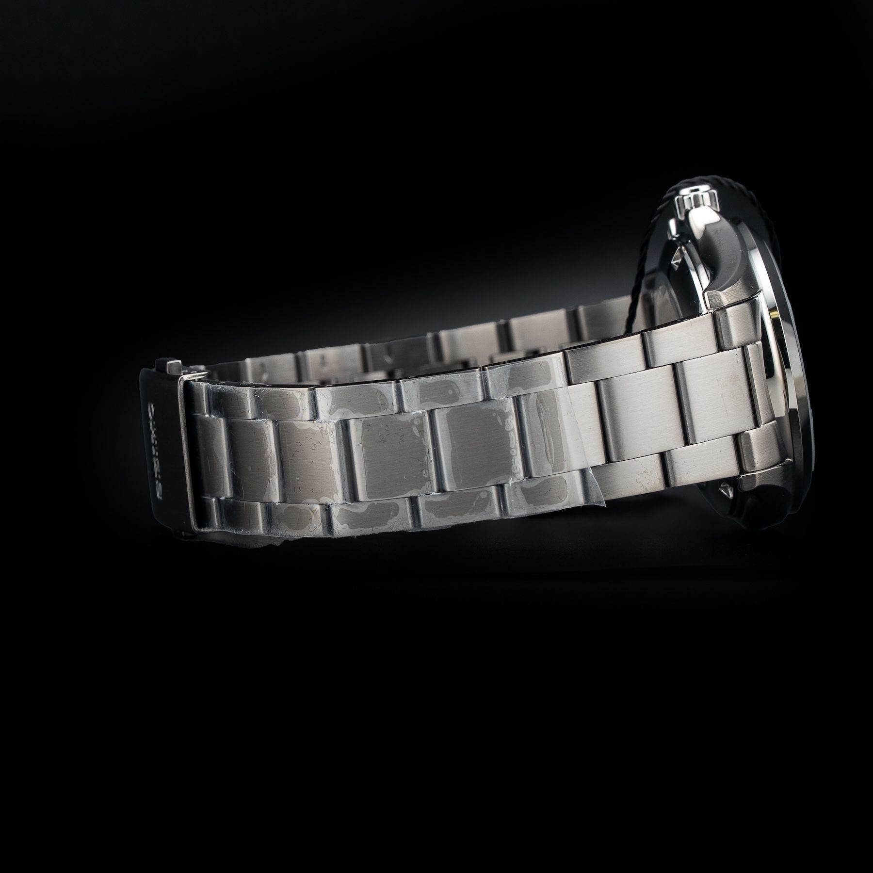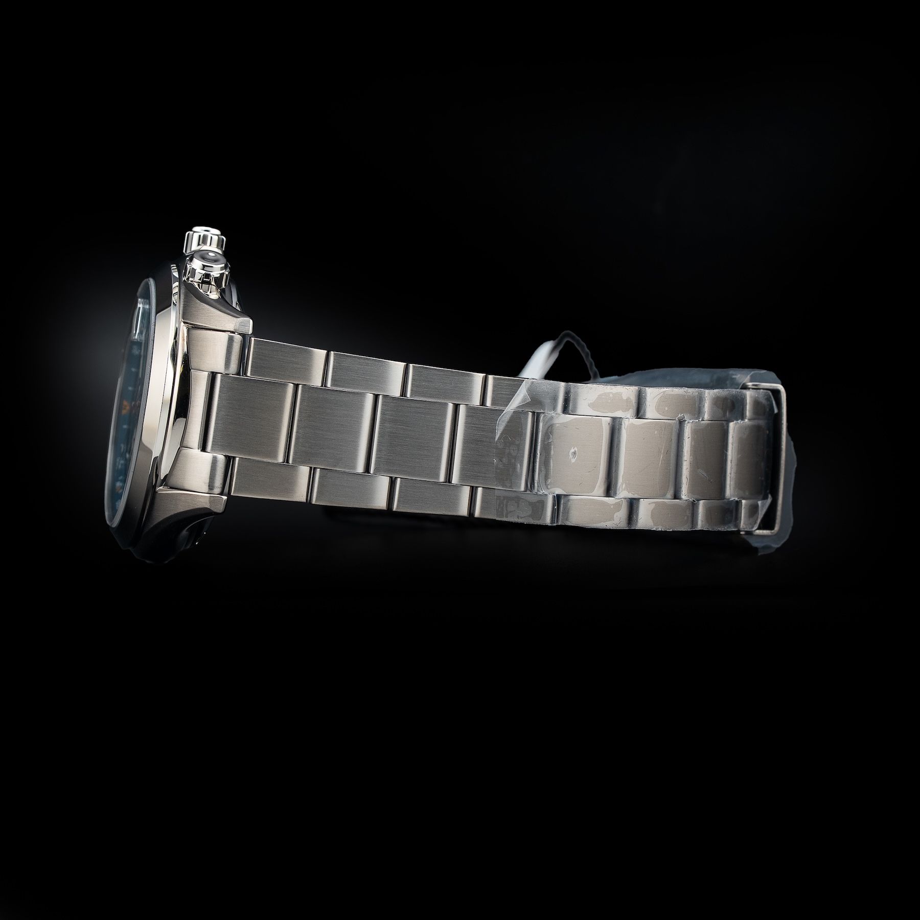 This watch features a 39.5mm stainless steel case on stainless steel bracelet. This watch also sports a turquoise dial. Powered by an automatic with manual winding movement. Water resistance up to 200 meters.
