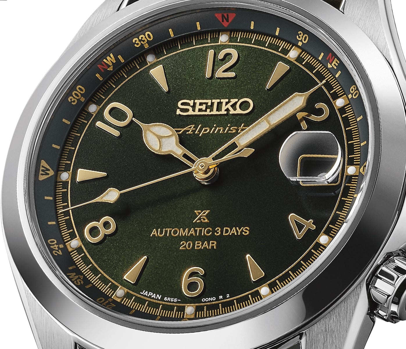 Carrying on the tradition of the original Laurel Alpinist launched in 1959, the Alpinist logo is placed just below the Seiko logo at the 12 o'clock position. The dial is rendered in a striking green color that enhances this watch’s distinctive presence.