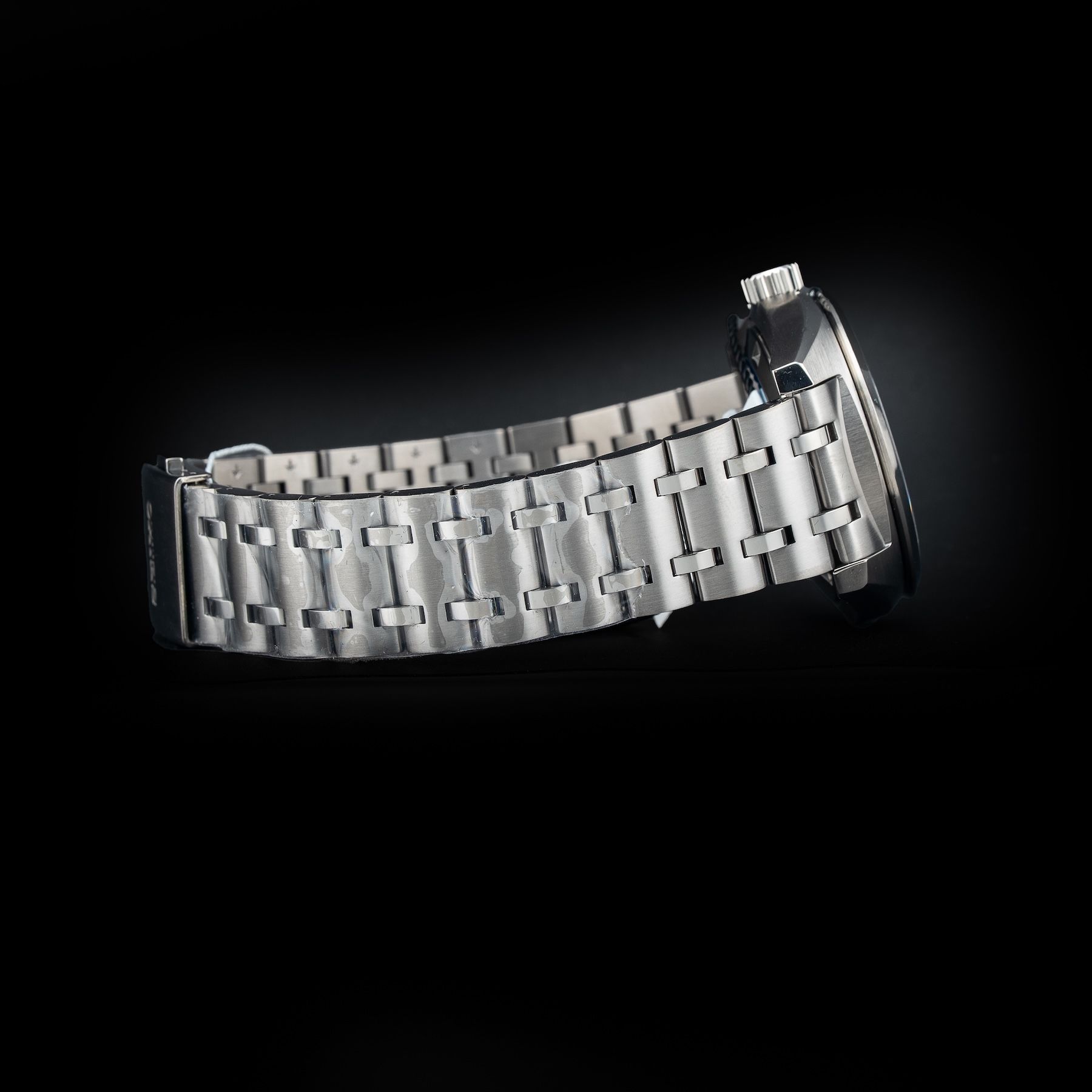 This watch features a 39mm stainless steel case on stainless steel bracelet. This watch also sports a black dial. Powered by a mechanical automatic movement. Water resistance up to 200 meters.