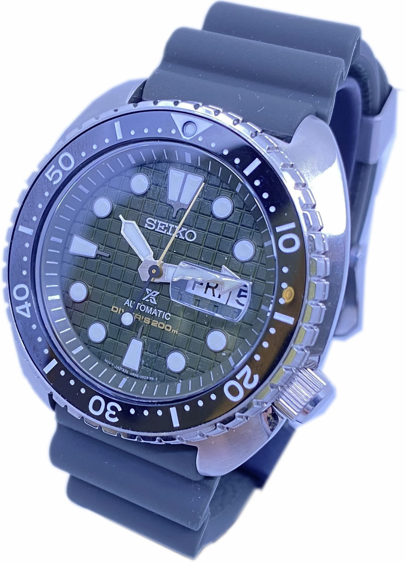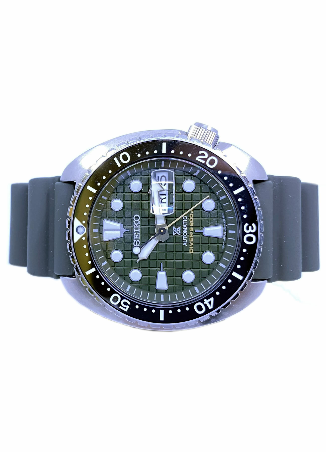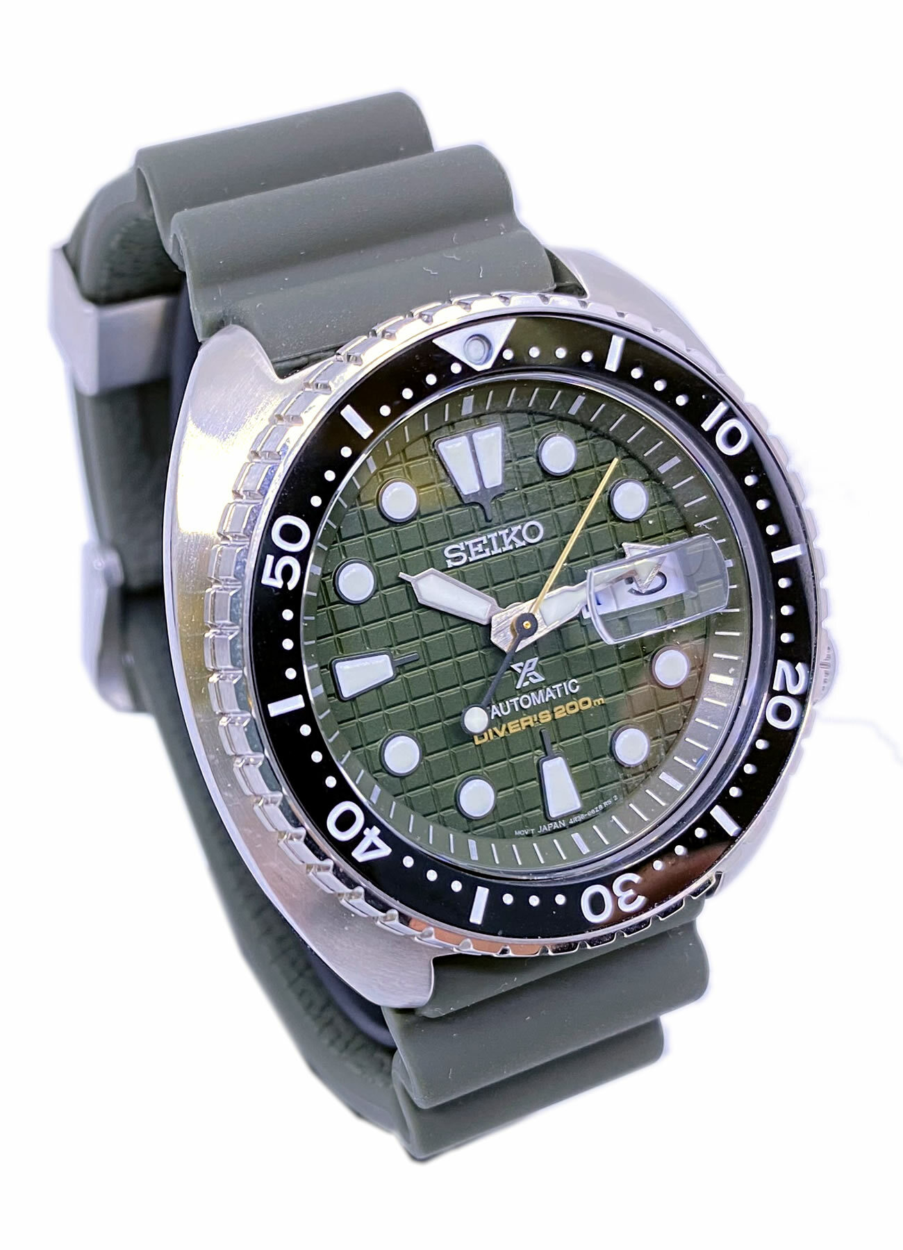 - This timepiece features a 45mm steel case paired with a high quality rubber strap. It showcases a distinctive green dial and is powered by a precise automatic winding movement. The watch is designed with a water resistance of up to 200m.