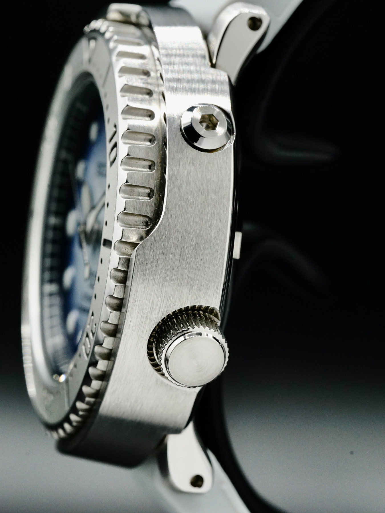 This Seiko Prospex SRPG59 features a 44mm steel case on rubber. This watch also sports a blue dial.