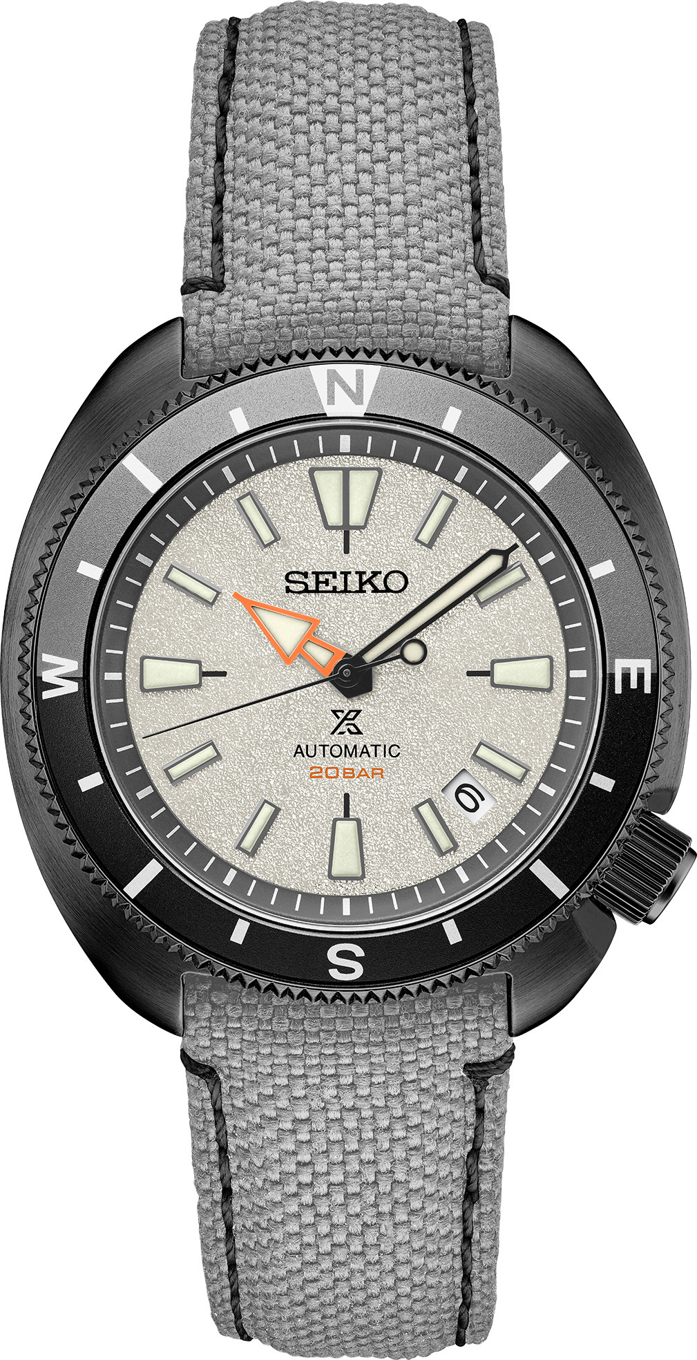 Prospex Land U.S. Special Edition. Designed for those who treat life as the ultimate adventure, Seiko Prospex keeps moving forward, meeting every challenge with technological excellence and winning design. Recalling the styles and earth-tone shades of the 1970s, as well as the colors of camping gear, this expanded collection is designed specifically for outdoor activities such as hiking, including a gray and black compass bezel and a listing of emergency codes on each screwdown caseback. Providing reliable timing for every adventure, the 23-jewel automatic movement beats at a frequency of 21,600 vibrations per hour, with a power reserve of approximately 41 hours, and offers manual winding capability. Based on an iconic Seiko design, with sleeker, more compact lines for everyday wear, this versatile watch features a textured gray dial with orange accents, date calendar, and LumiBrite hands and markers. In stainless steel with black hard coating, secure screwdown crown and scratch-resistant sapphire crystal, this exceptional timepiece includes a gray nylon/leather hybrid strap as well as an additional strap in black leather. 20 bar, 200M Water Resistant