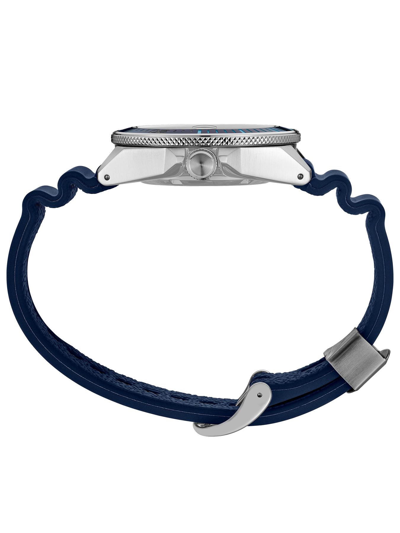 - This timepiece features a 43mm steel case paired with a high quality rubber strap. It showcases a distinctive blue dial and is powered by a precise automatic winding movement. The watch is designed with a water resistance of up to 200m.
