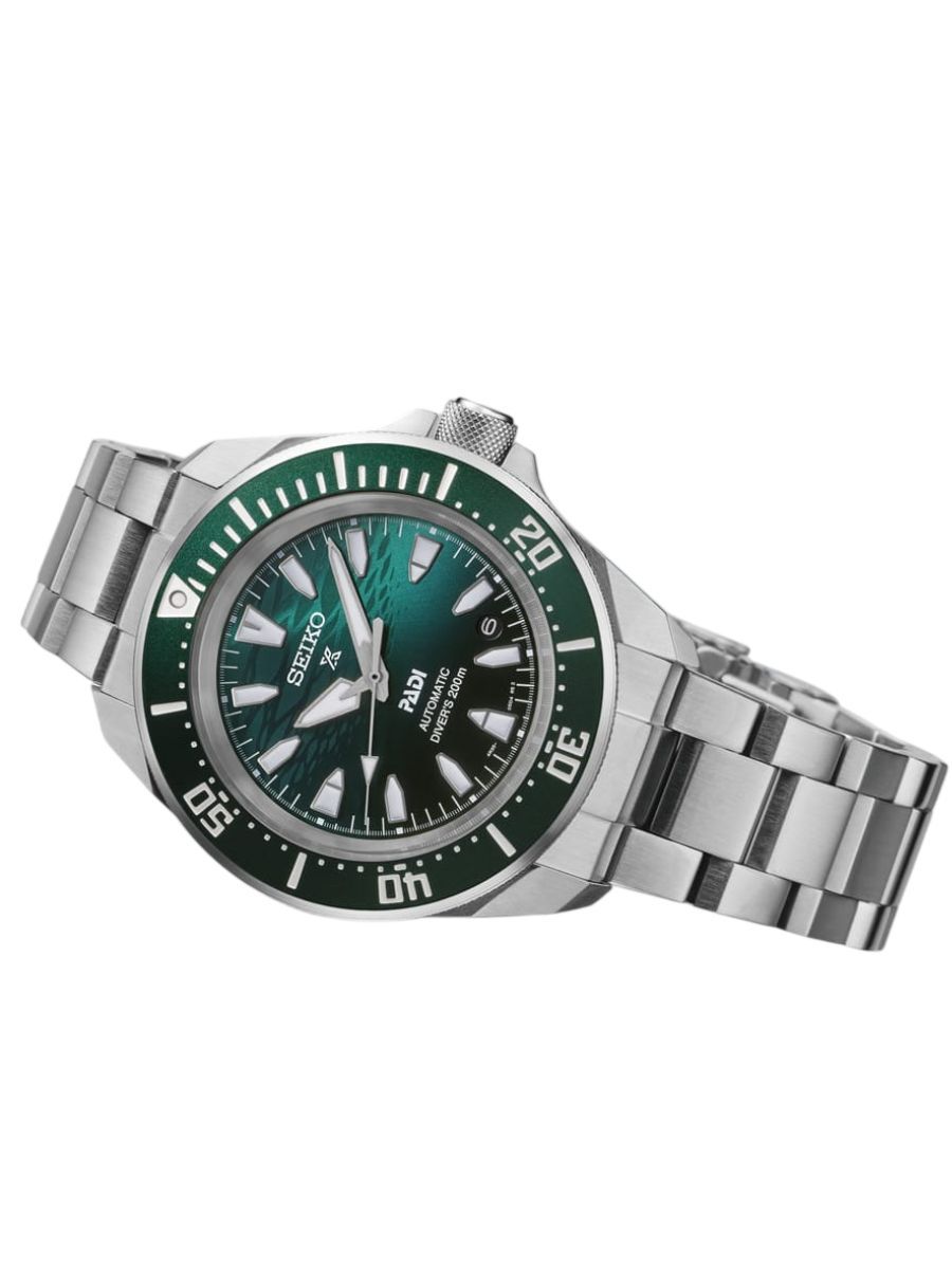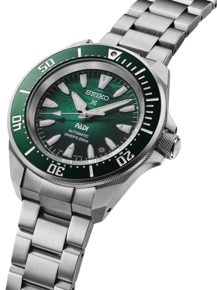 An emerald-green gradation dial inspired by the shimmering light and rippling surface as seen from underwater.