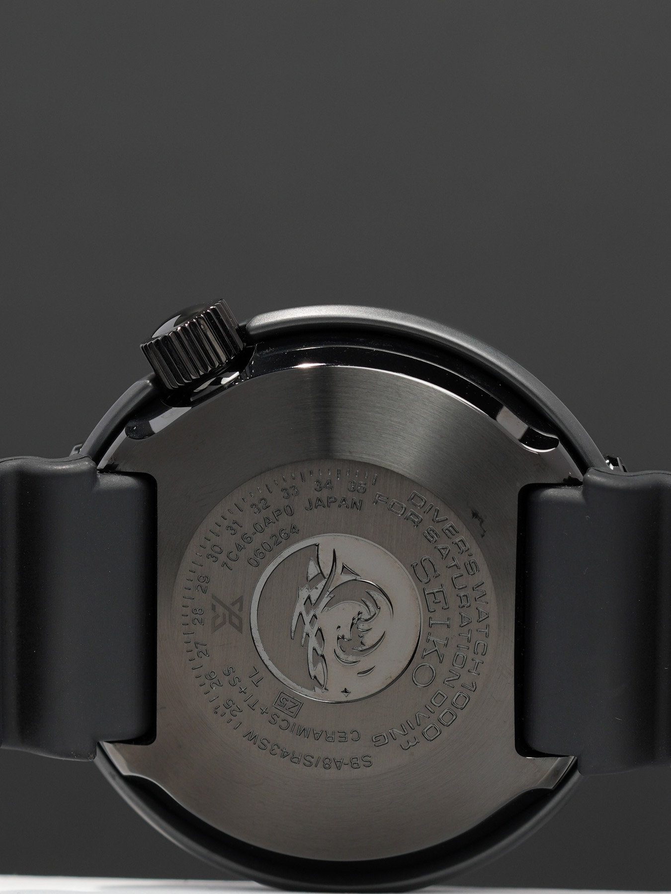- This timepiece features a 47mm titanium case paired with a high quality rubber strap. It showcases a distinctive black dial and is powered by a precise quartz winding movement. The watch is designed with a water resistance of up to 1000m.