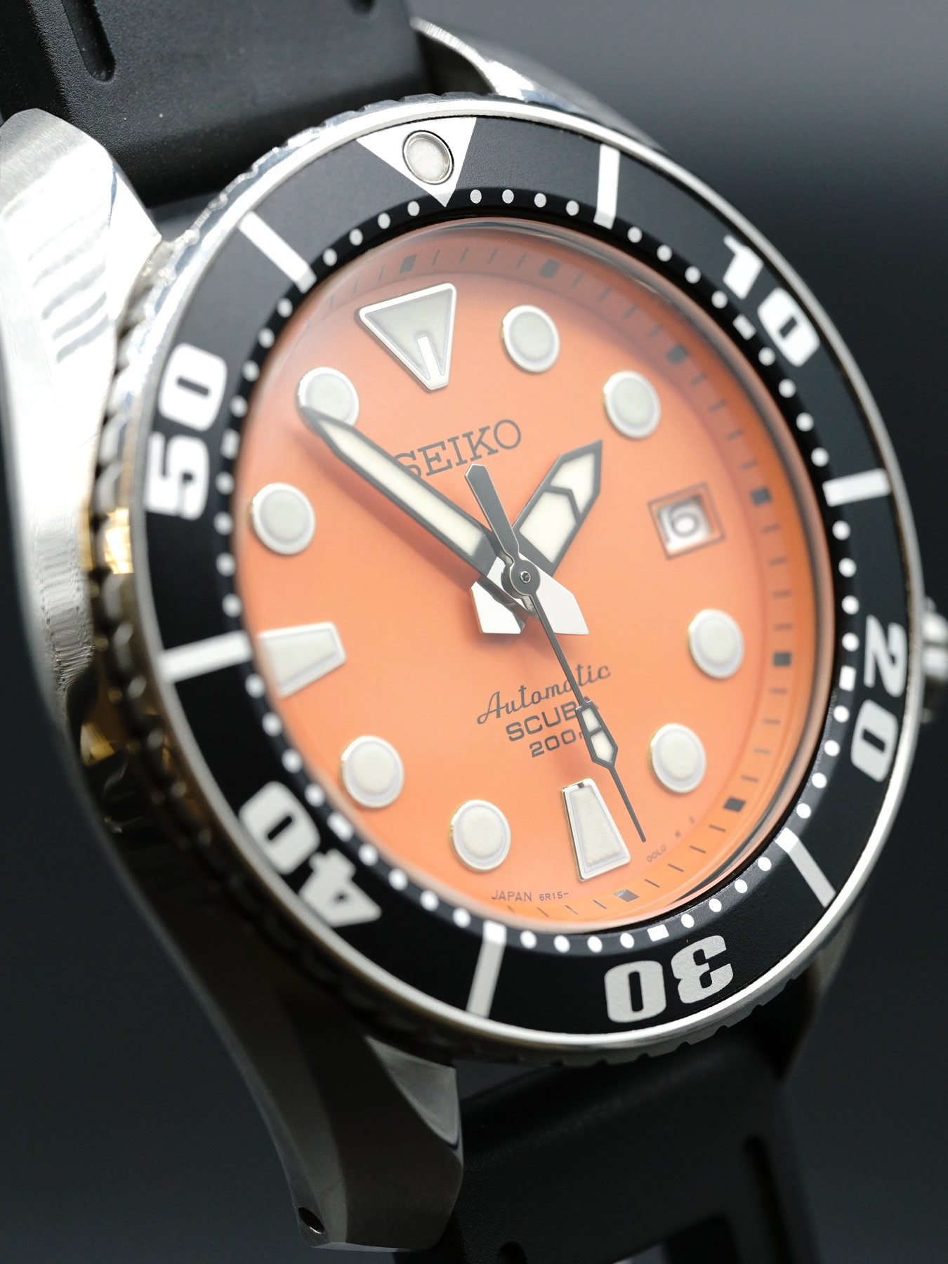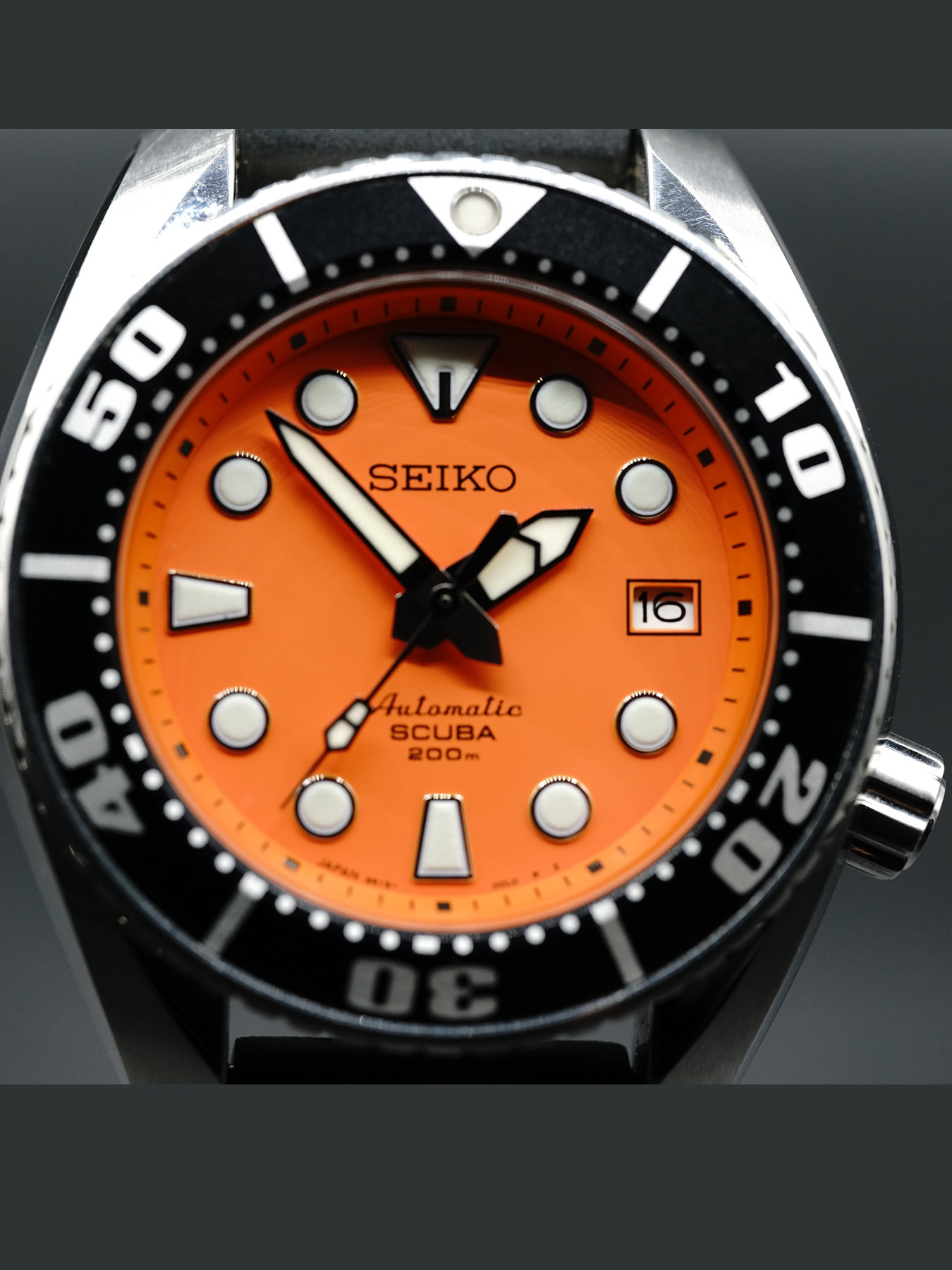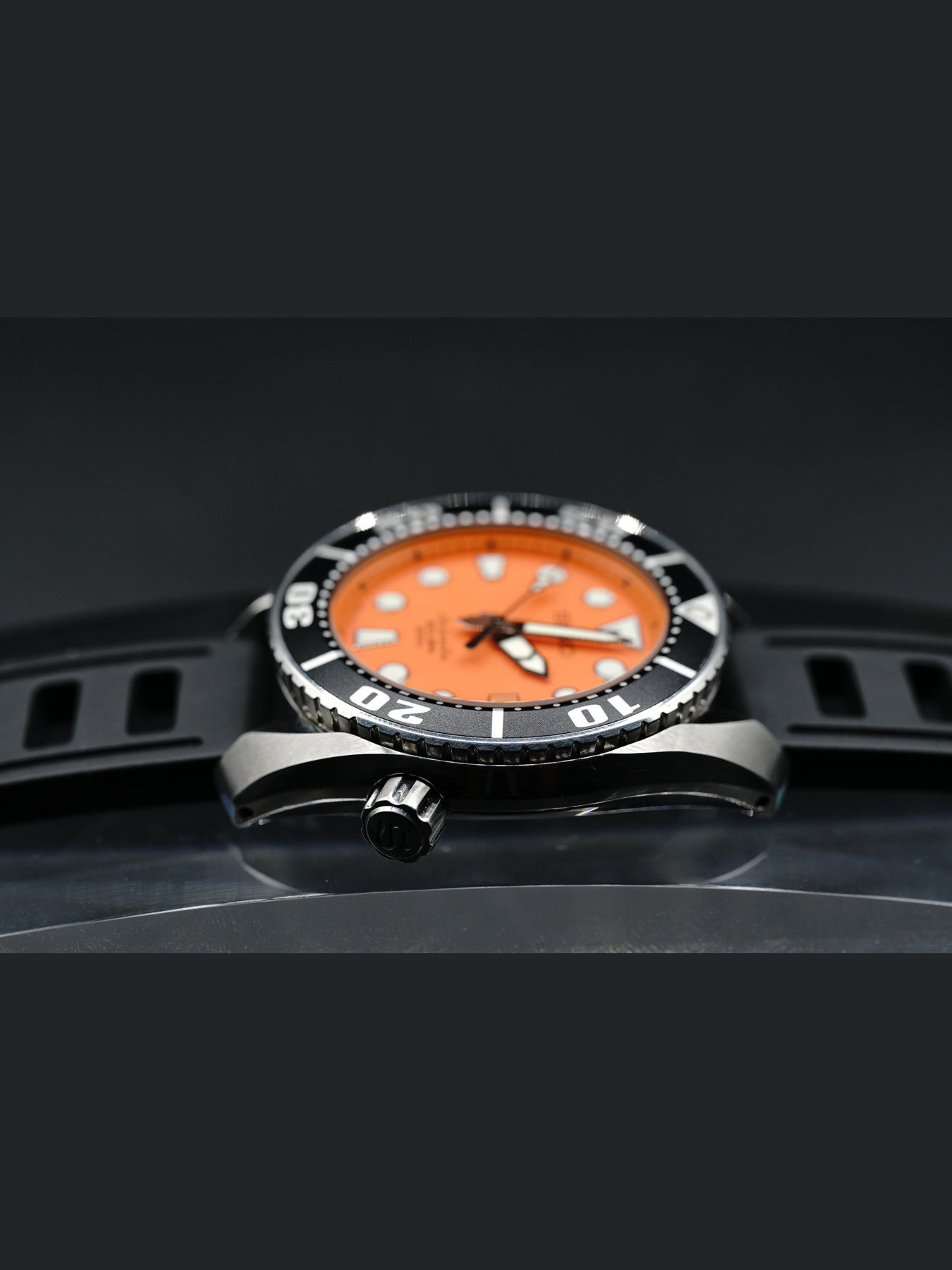 - This timepiece features a 45mm steel case paired with a high quality rubber strap. It showcases a distinctive orange dial and is powered by a precise automatic winding movement. The watch is designed with a water resistance of up to 200m.