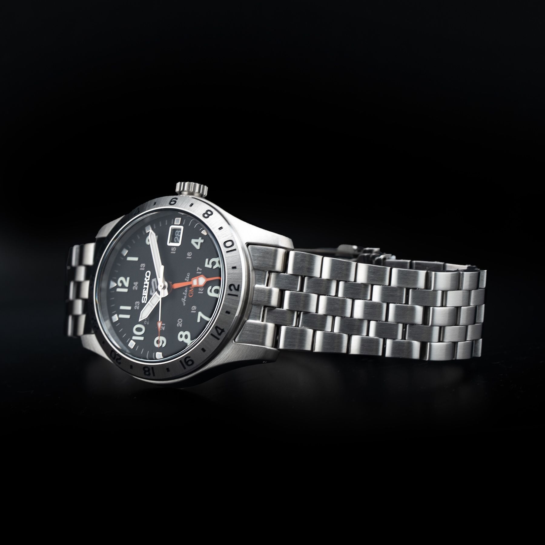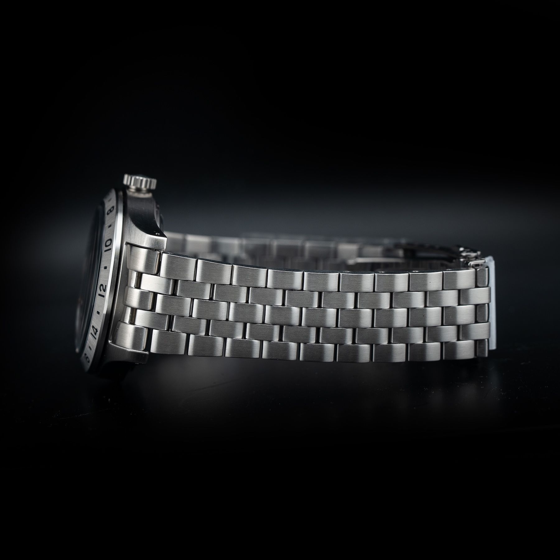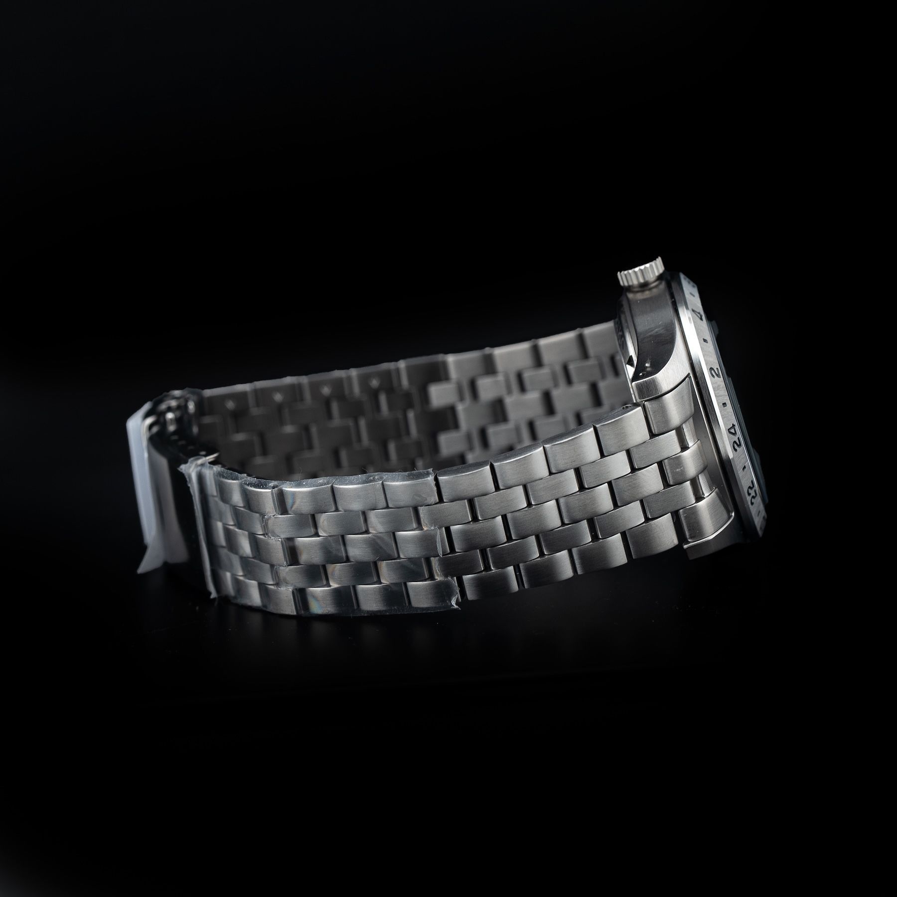 - This timepiece features a 39mm steel case paired with a high quality steel bracelet. It showcases a distinctive black dial and is powered by a precise atuomatic winding movement. The watch is designed with a water resistance of up to 100m.