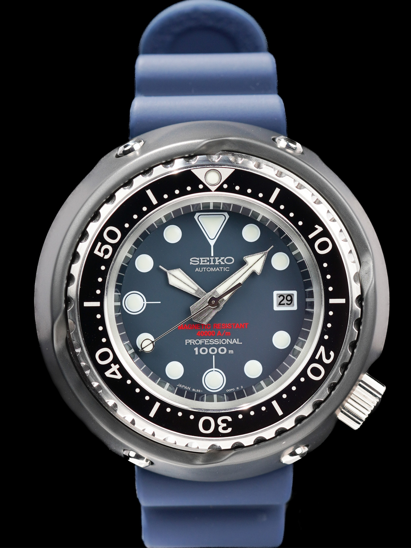 - This timepiece features a 52mm titanium case paired with a high quality rubber strap. It showcases a distinctive blue dial and is powered by a precise automatic winding movement. The watch is designed with a water resistance of up to 1000m.