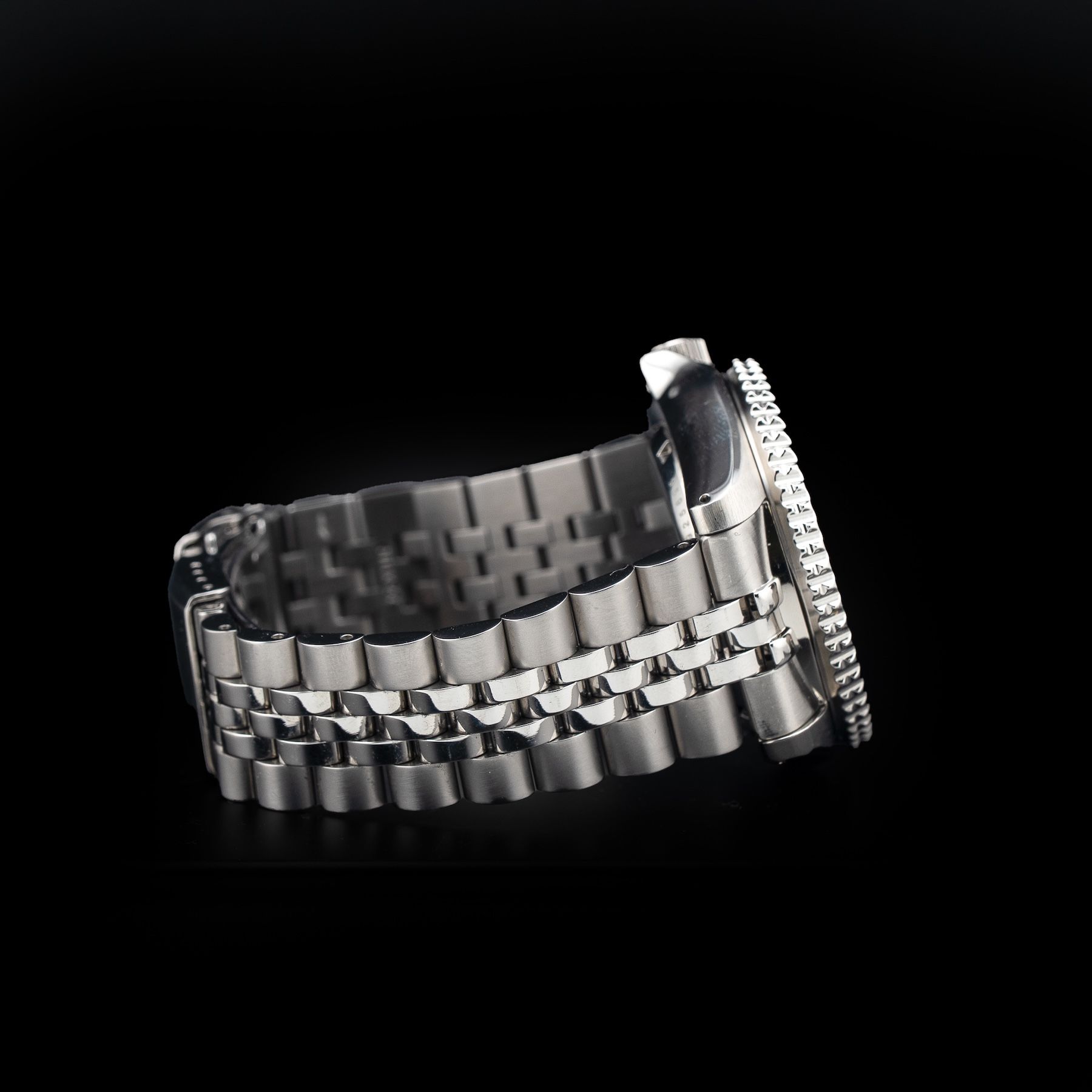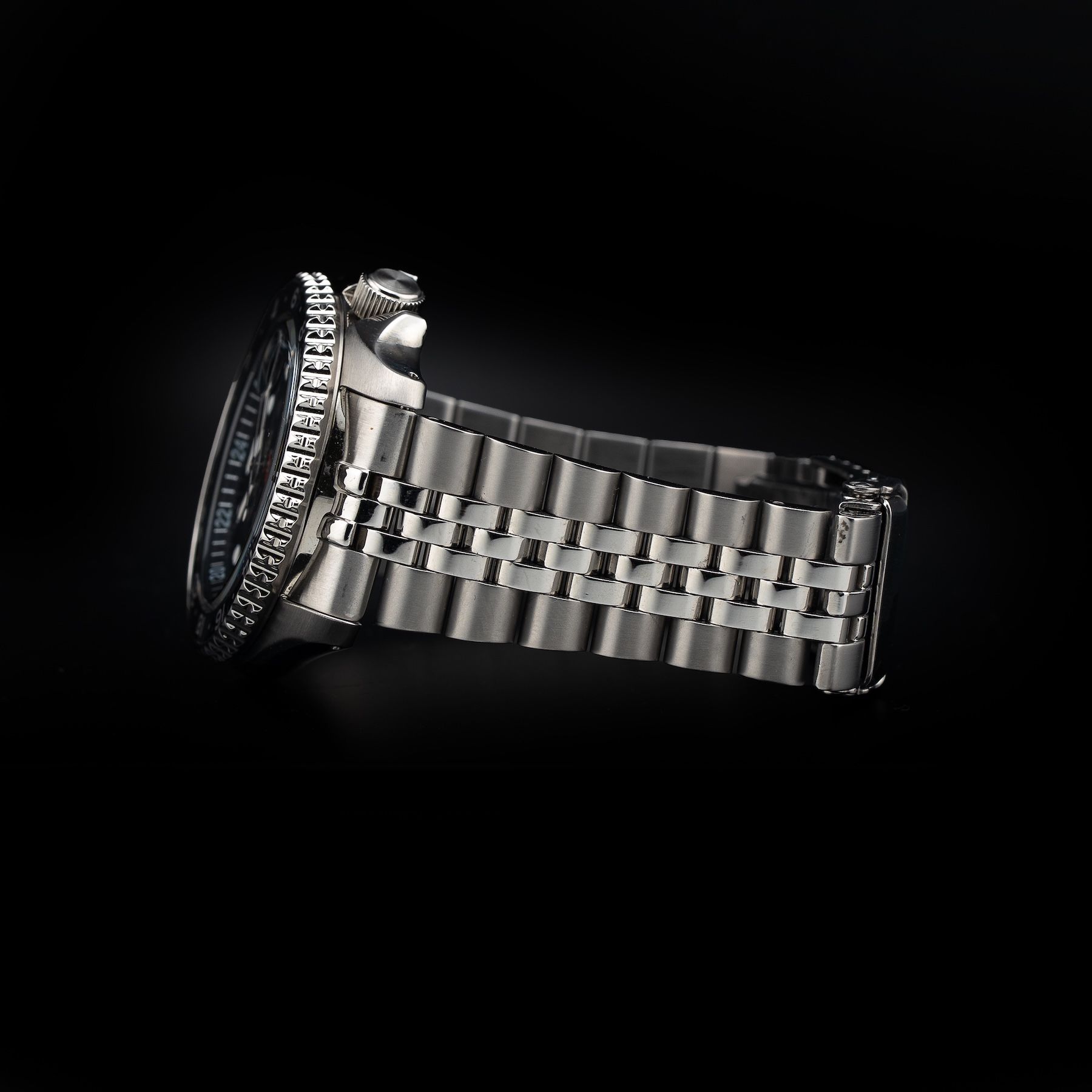 - This timepiece features a 42mm steel case paired with a high quality steel bracelet. It showcases a distinctive black dial and is powered by a precise automatic winding movement. The watch is designed with a water resistance of up to 100m.