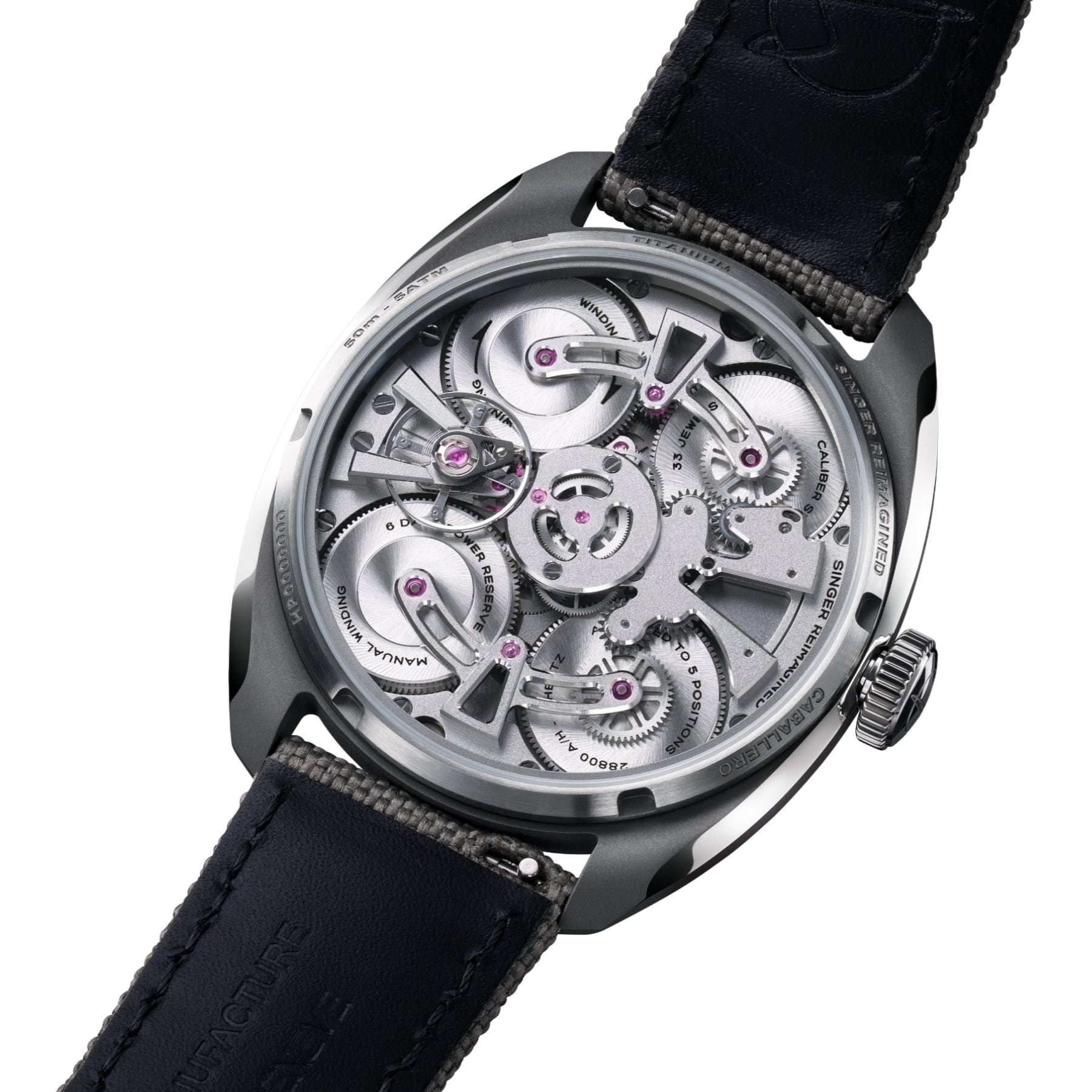 The familiar 39 mm Caballero case is now offered in Grade 5 titanium, featuring an exceptional micro-sandblasted finish, contrasted by mirror-polished edges that frame the iconic C-shaped profile. A mirror-polished titanium bezel adds further contrast and a sense of preciousness, reinforcing Singer’s finishing-focused approach to modern sport elegance.