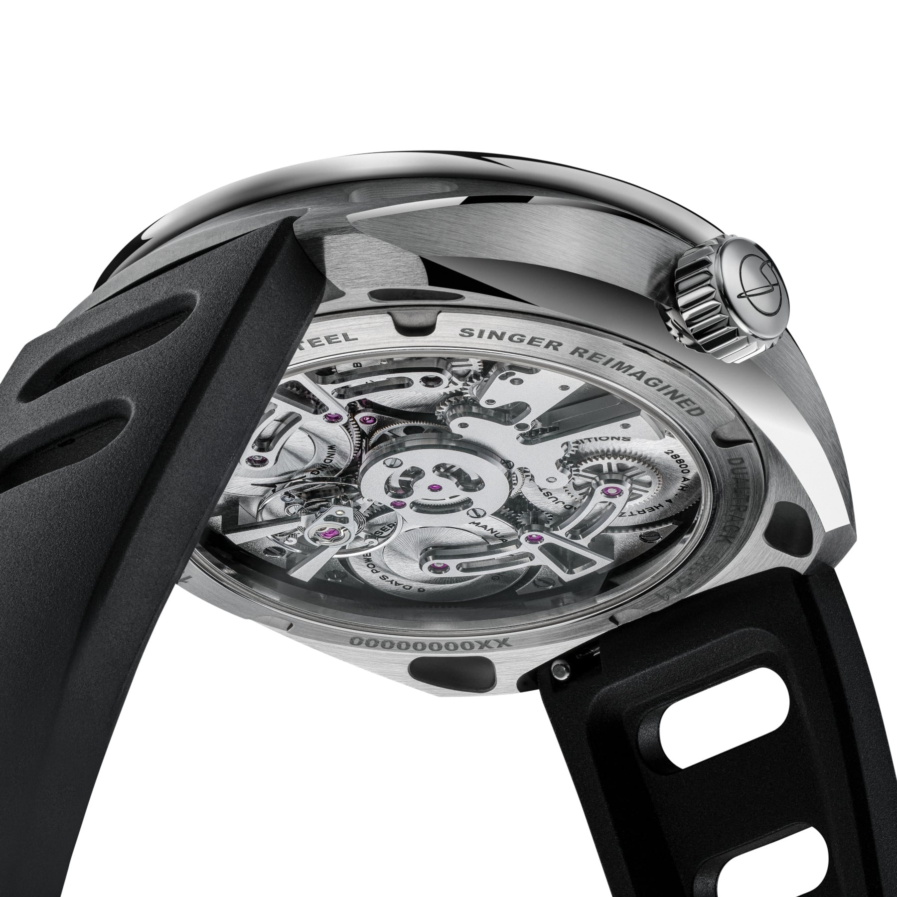 Worn on Singer’s signature openworked caoutchouc strap, the Singer caoutchouc strap combines flexibility with durability, offering exceptional comfort on the wrist.