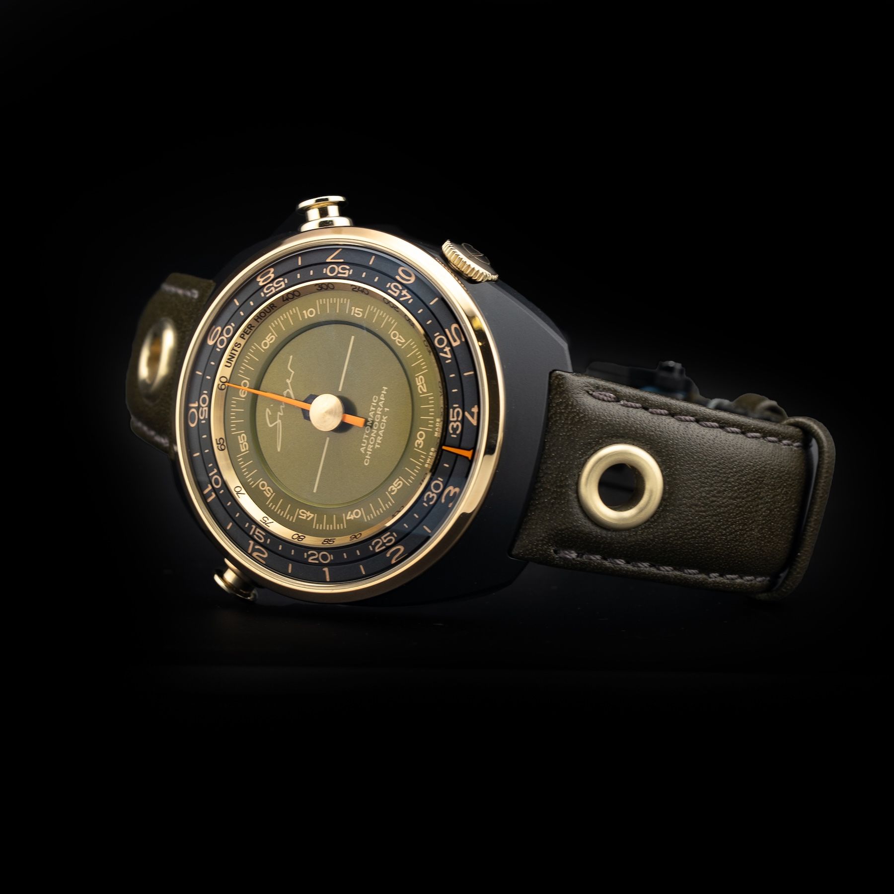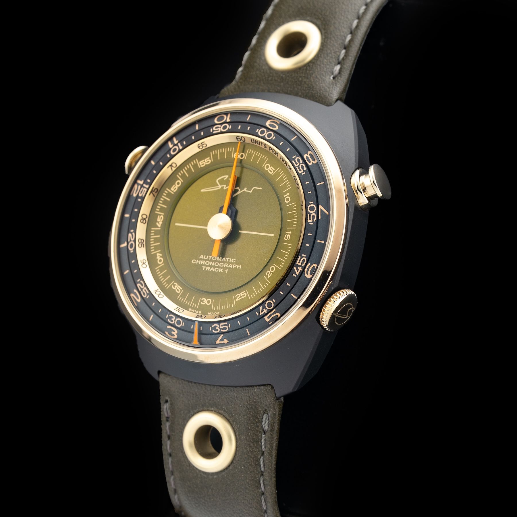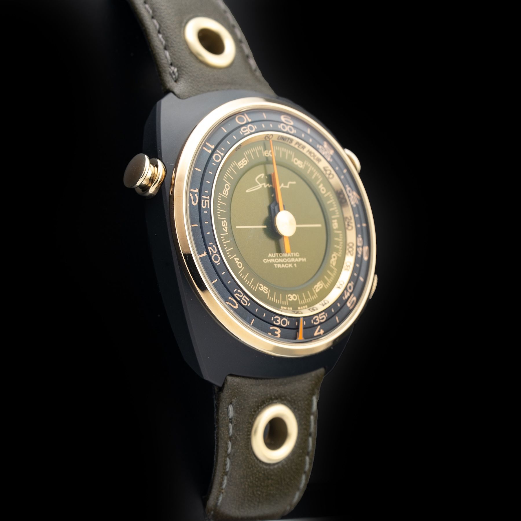 This Singer Reimagined Sr005 Track 1 Emirates Edition is in GREAT condition. This watch includes its Original Box, Original Papers, Warranty Card Dated 06/23/22 and Additional Army Green Canvas Strap. This watch has been fully authenticated and certified by Exquisite Timepieces.