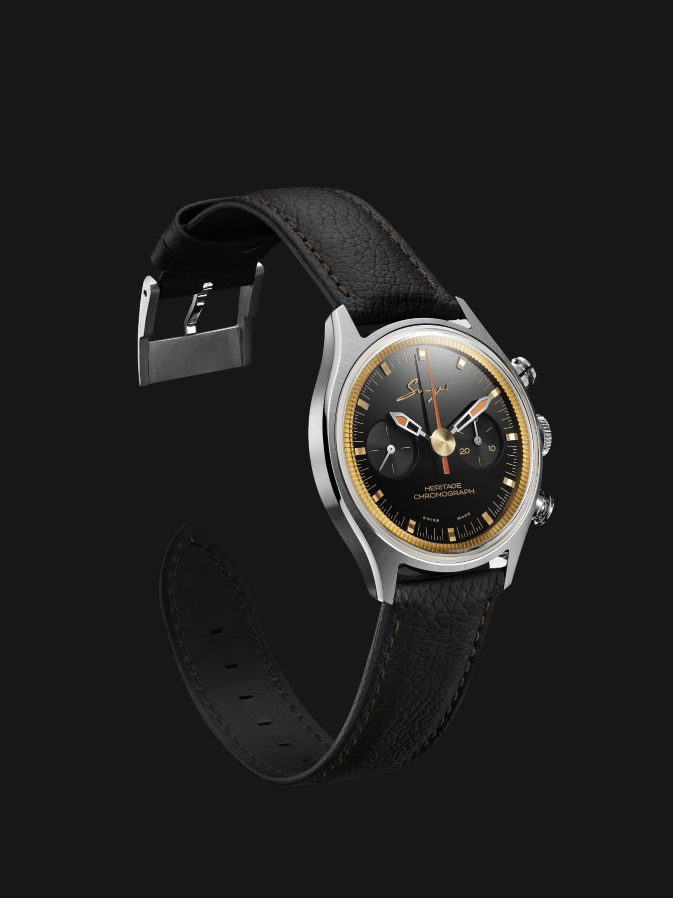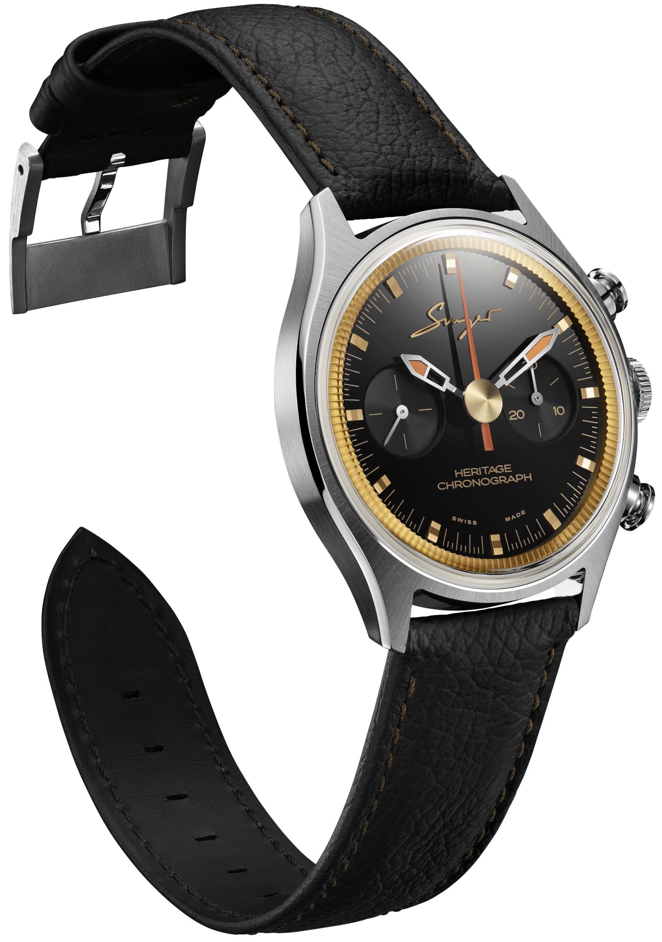 The watch features Singer’s signature design elements, including a toothed golden flange, lacquered dials, and applied indices that evoke timeless elegance.