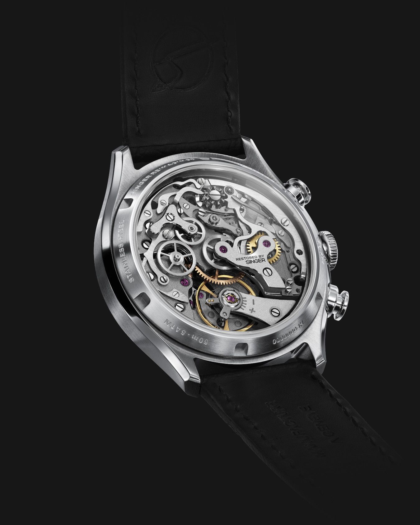 A sapphire crystal case back offers a window into the restored movement, each bearing the engraving Restored by Singer, marking its place in the brand’s pursuit of horological excellence.