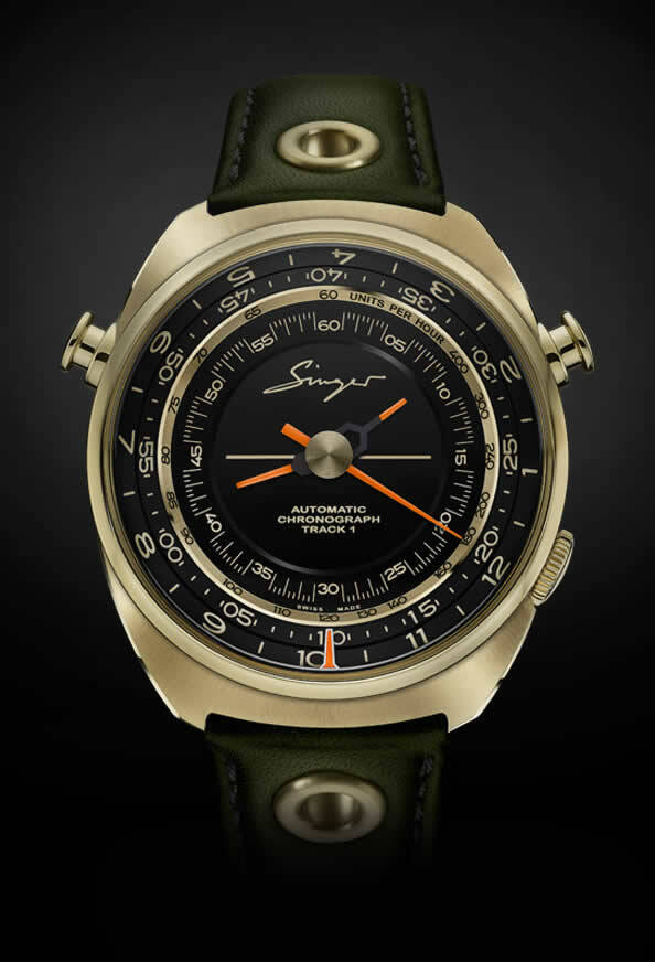 The Track 1 – Geneva Edition is showcased in a rare light yellow shade (1N) subtly finished with alternating brushed and polished surfaces. The design cues clearly hark from a golden age, namely the 1970s. The Track 1 – Geneva Edition is showcased in a rare light yellow shade (1N) subtly finished with alternating brushed and polished surfaces. The design cues clearly hark from a golden age, namely the 1970s. The dial features a new layout with a unique large central chronograph counter. Its pure, minimal design allows for a radical focus on functionality as it should for a stop-watch. The chronograph indications and chapter ring have been moved to the outer part the dial, leaving the central area free for the Singer logo and script ‘Automatic Chronograph Track1’. A gloss black finish highlights the matte gold discs and inscriptions. A delicate golden line runs horizontally through the dial as a final vintage note. 43 mm in diameter, the dynamic barrel-shaped case features an ergonomic shape emphasized by alternate sunray brushed and polished finishes. The start stop pushers are located on either side of the case for enhanced operations. The crown is seamlessly integrated into the base band.