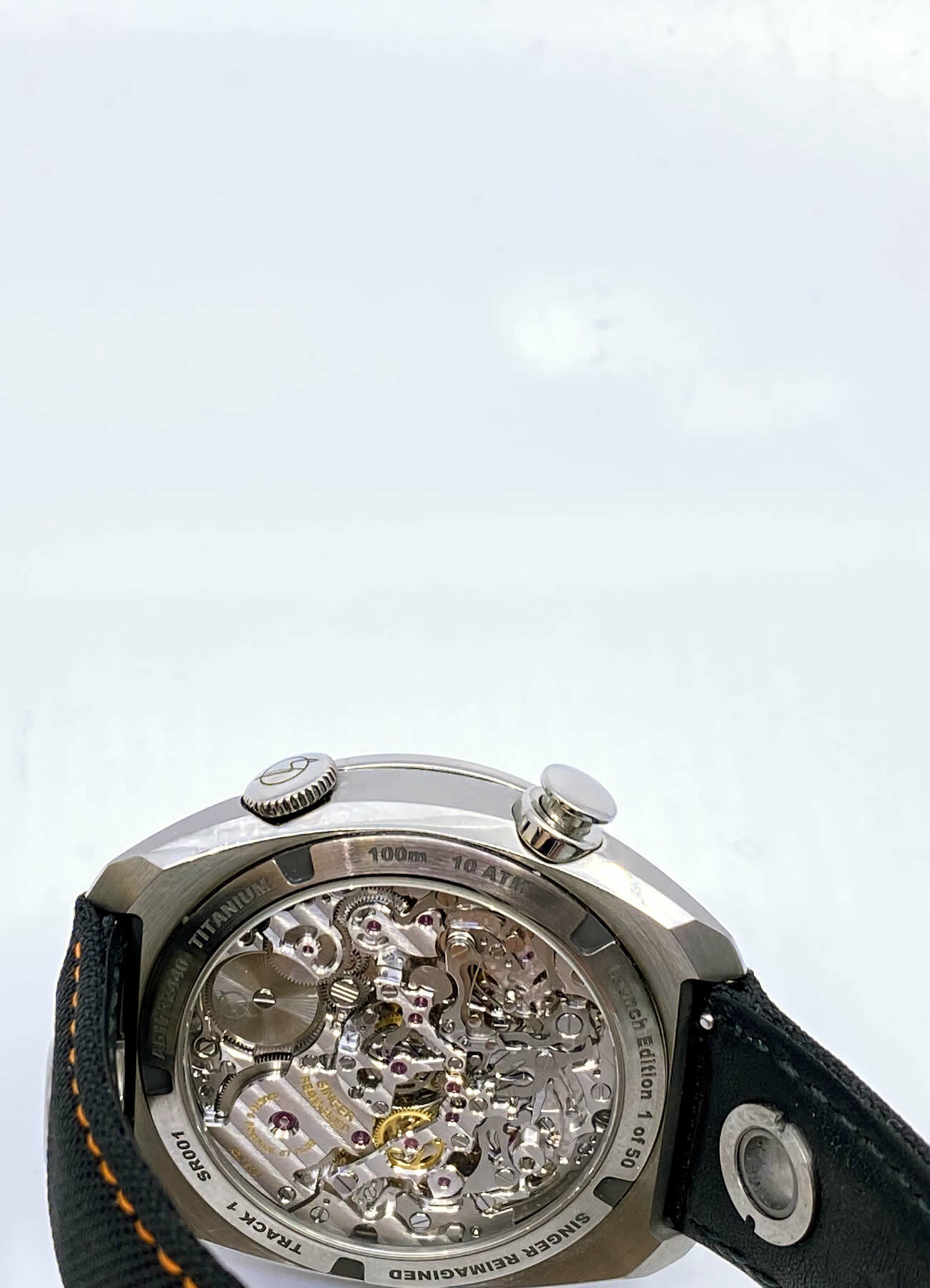 The lofty objective of Singer Reimagined is to distill, enhance and combine the elements of greatness that define the iconic stop watches of the 1960s and 1970s. With clean, dynamic lines, the stylish case offers a modern take on classic 1960s chronograph design. It has a distinctive barrel-shape with a thin, round bezel and it is softly curved for enhanced ergonomics. 43 mm in diameter, it is crafted from titanium with alternate polished and sunray brushed finishes. To enhance legibility as much as possible, also the face of the watch features various finishes to create a sense of depth and contrast.