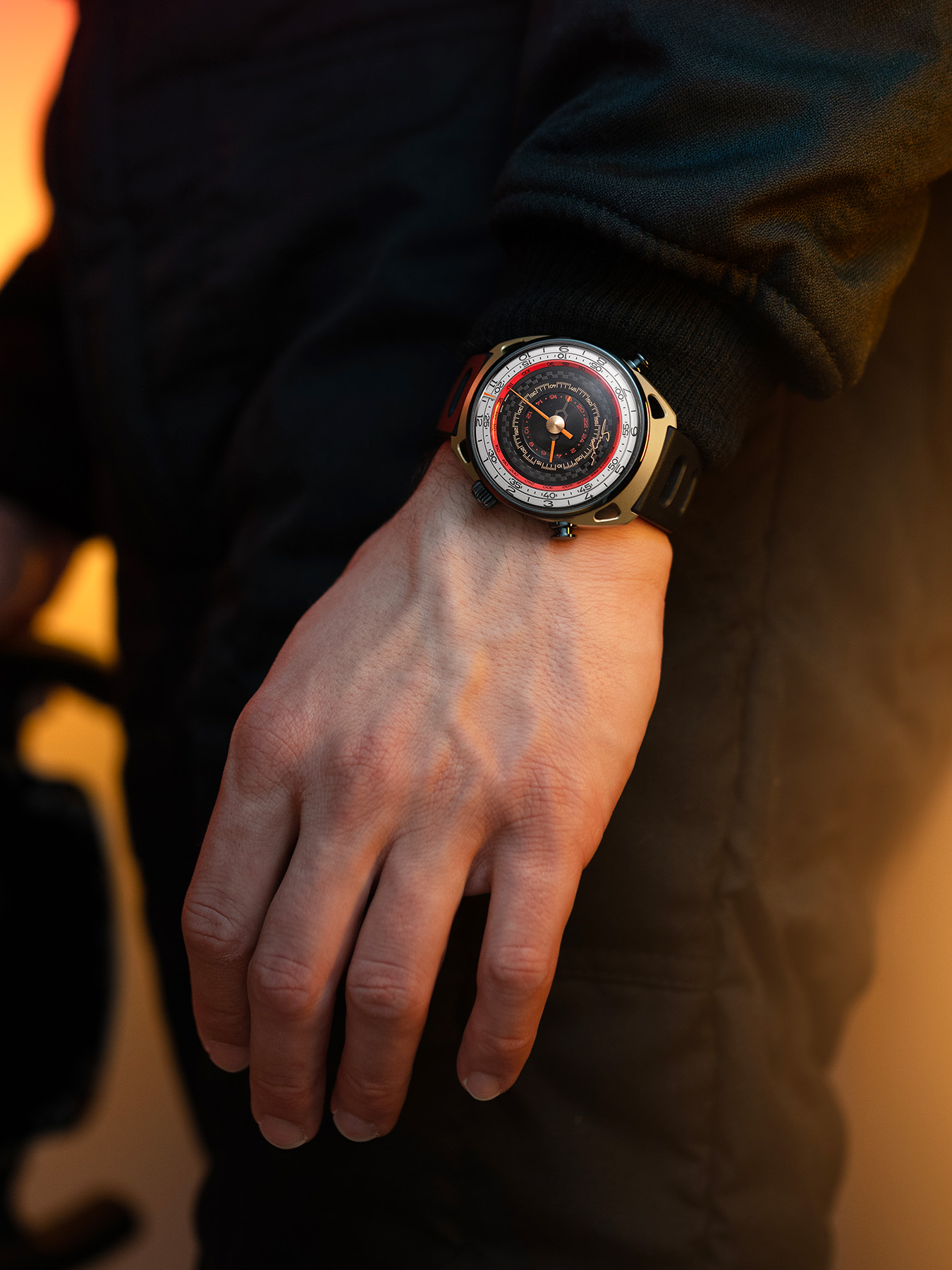 Black, Two rotating ceramic discs, displaying the time of day and presented in Singer Racing White. Inside these, a rehaut is presented in Singer Racing Red. Singer logo applied
