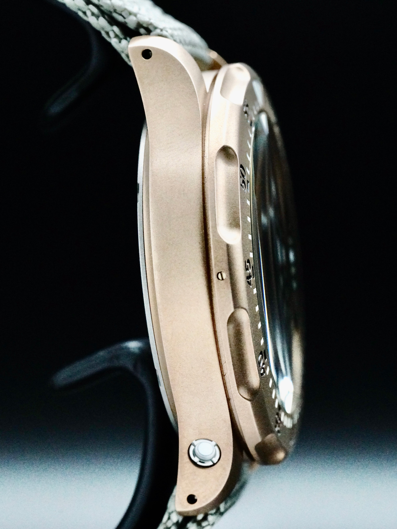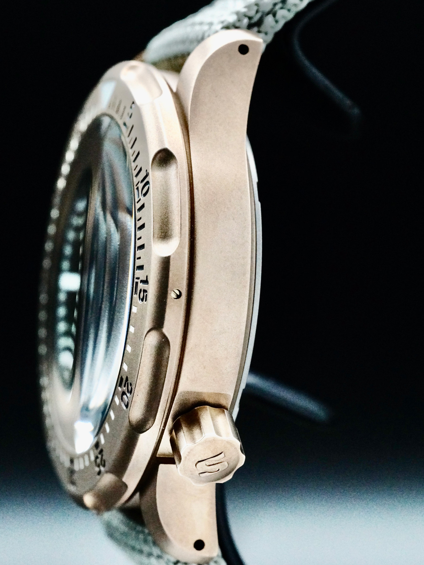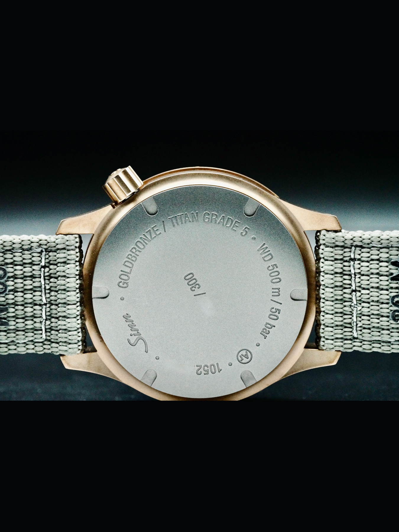 This watch is made of a very special bronze and gold alloy developed by Sinn, referred to as Goldbronze 125. This alloy has an exceptionally high degree of purity, and one eighth of it is gold. Bronze is a material that has been used frequently in a wide range of maritime applications in the past. However, the exceptionally high degree of purity of our Goldbronze 125 results in improved skin compatibility and increased corrosion resistance to seawater compared to conventional bronze alloys. The Goldbronze 125 case and Captive safety bezel both have a bead-blasted finish. The case back of the T50 GOLDBRONZE is made of high-strength titanium for extra comfort when wearing this watch.