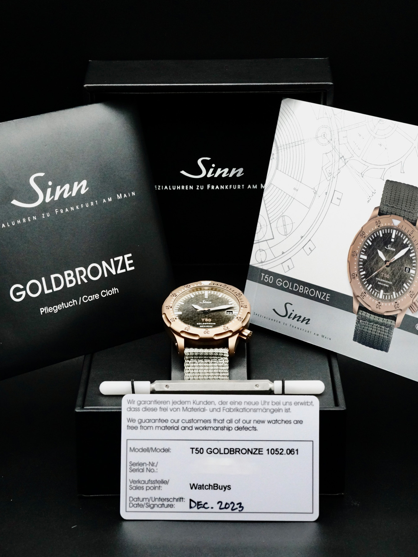 This Sinn T50 GOLDBRONZE 1052.061 is in EXCELLENT condition. This watch includes its original box, instruction manual, polishing cloth, and warranty card dated for 2023. This watch has been fully authenticated and certified by Exquisite Timepieces.