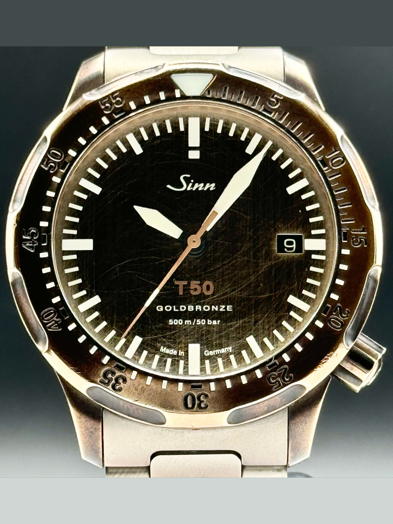 This Sinn 1052.061 T50 Goldbronze is in GREAT condition. This watch includes its Original Box, Original Papers, Warranty Card dated 02/26/24, Extra Bracelet Link and Extra grey fabric strap. This watch has been fully authenticated and certified by Exquisite Timepieces.