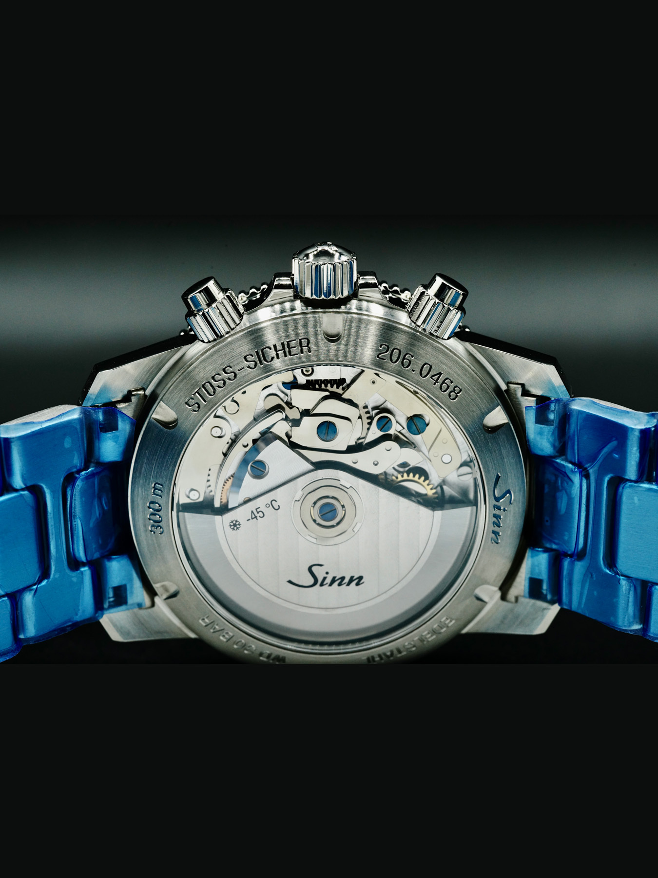 This Sinn 206 ARKTIS II features a 43mm stainless steel case with a solid case back on a stainless steel bracelet. This watch also sports a blue dial with luminous hands and index dial markers covered by scratch resistant sapphire crystal.
