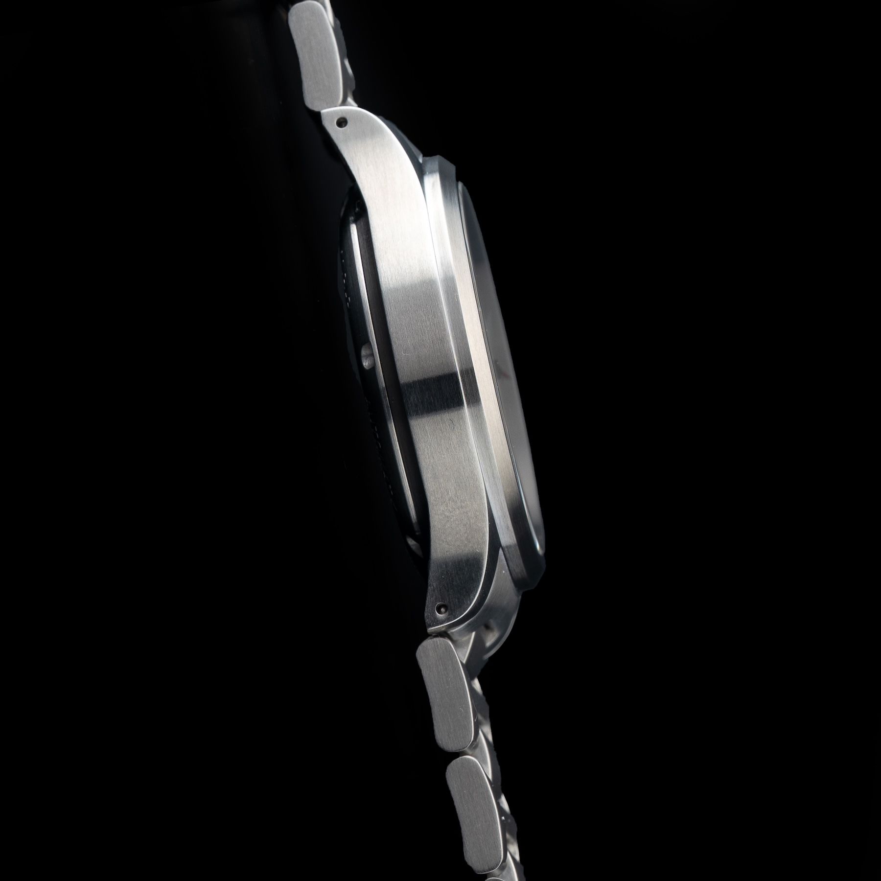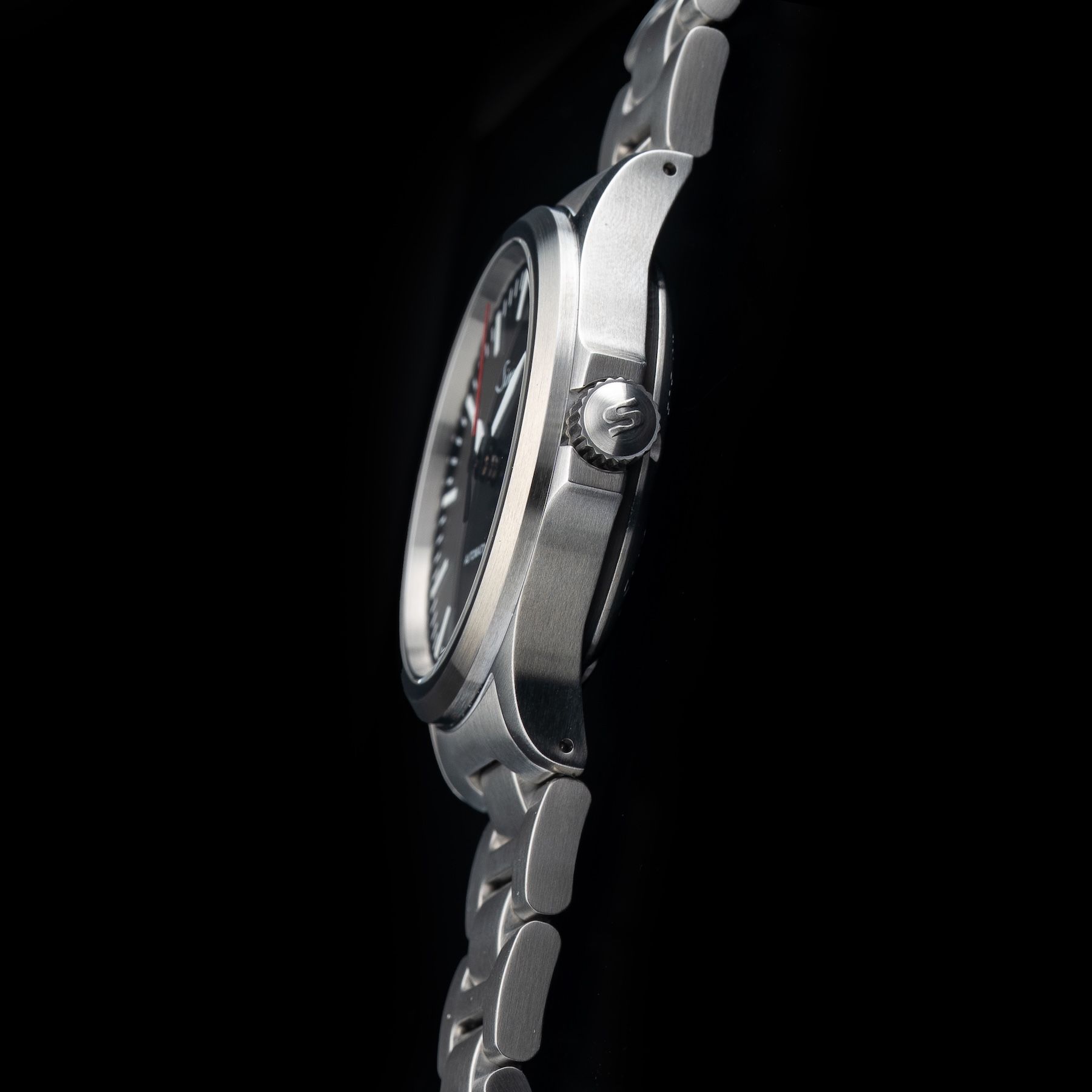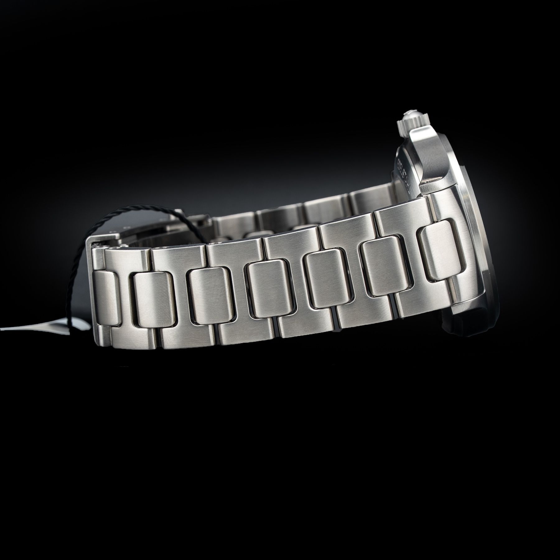 This watch features a 38.5mm stainless steel case on stainless steel bracelet. This watch also sports a black dial. Powered by a self-winding mechanism movement. Water resistance up to 200 meters.