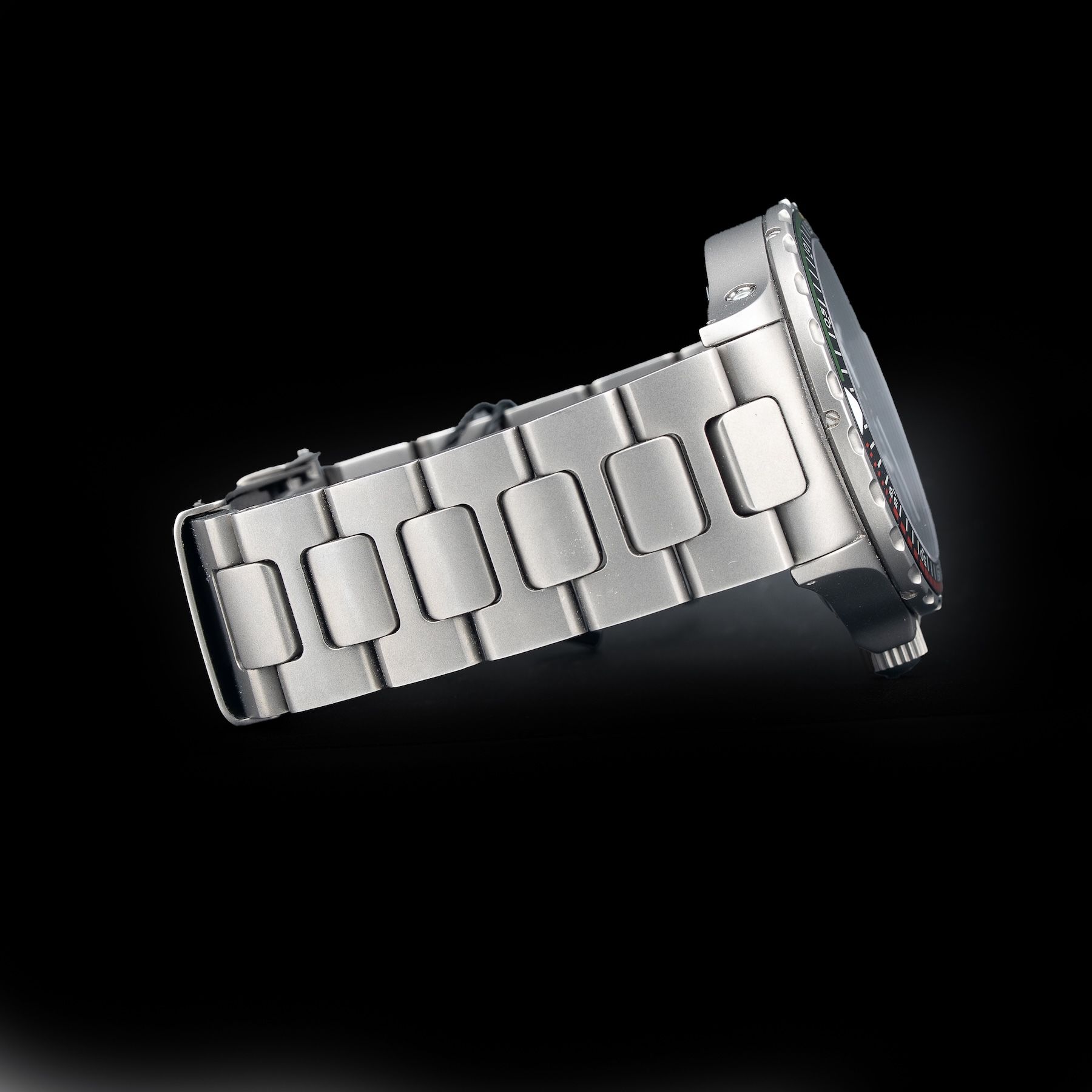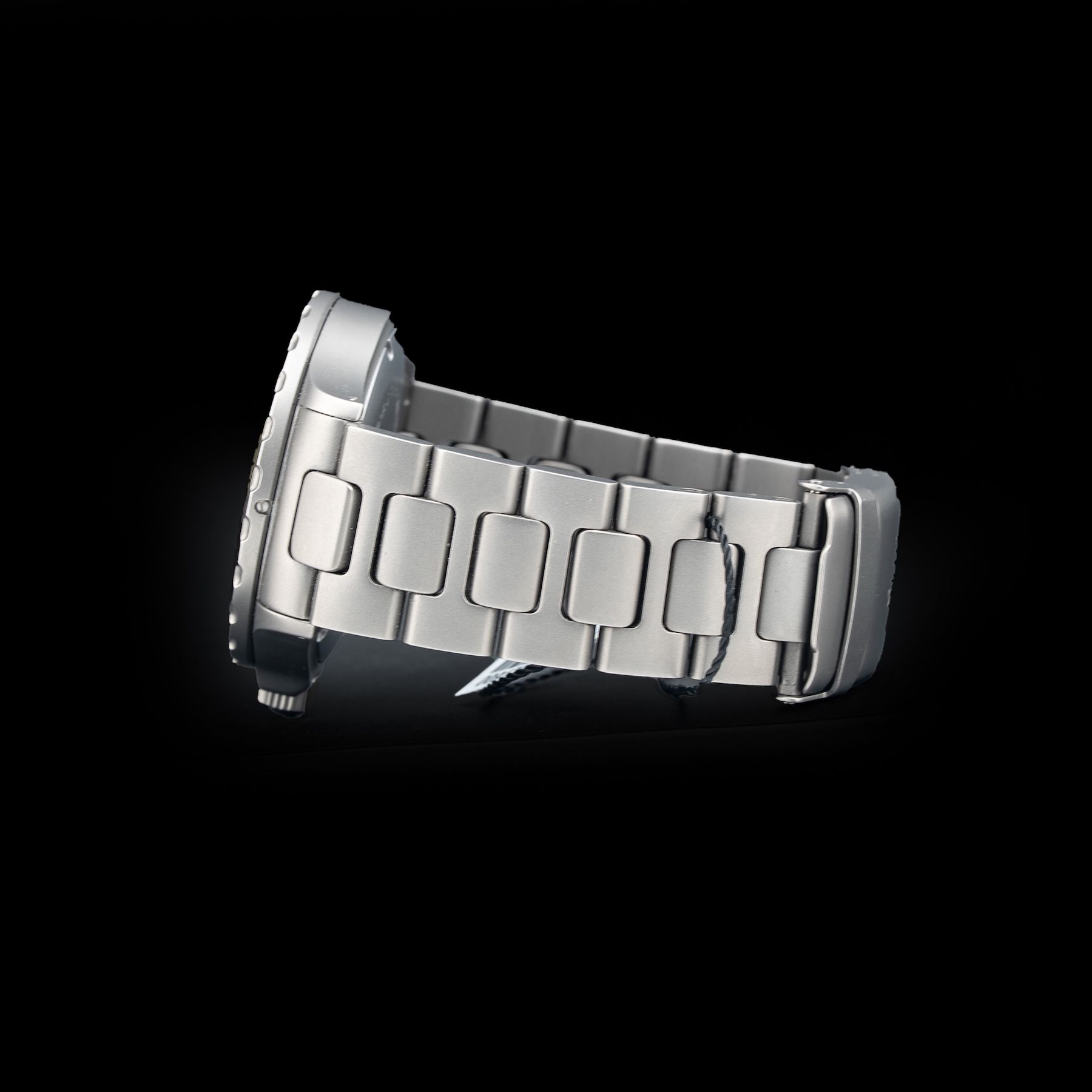 This watch features a 43mm stainless steel case on stainless steel bracelet. This watch also sports a black dial. Powered by a self-winding mechanism movement. Water resistance up to 200 meters.