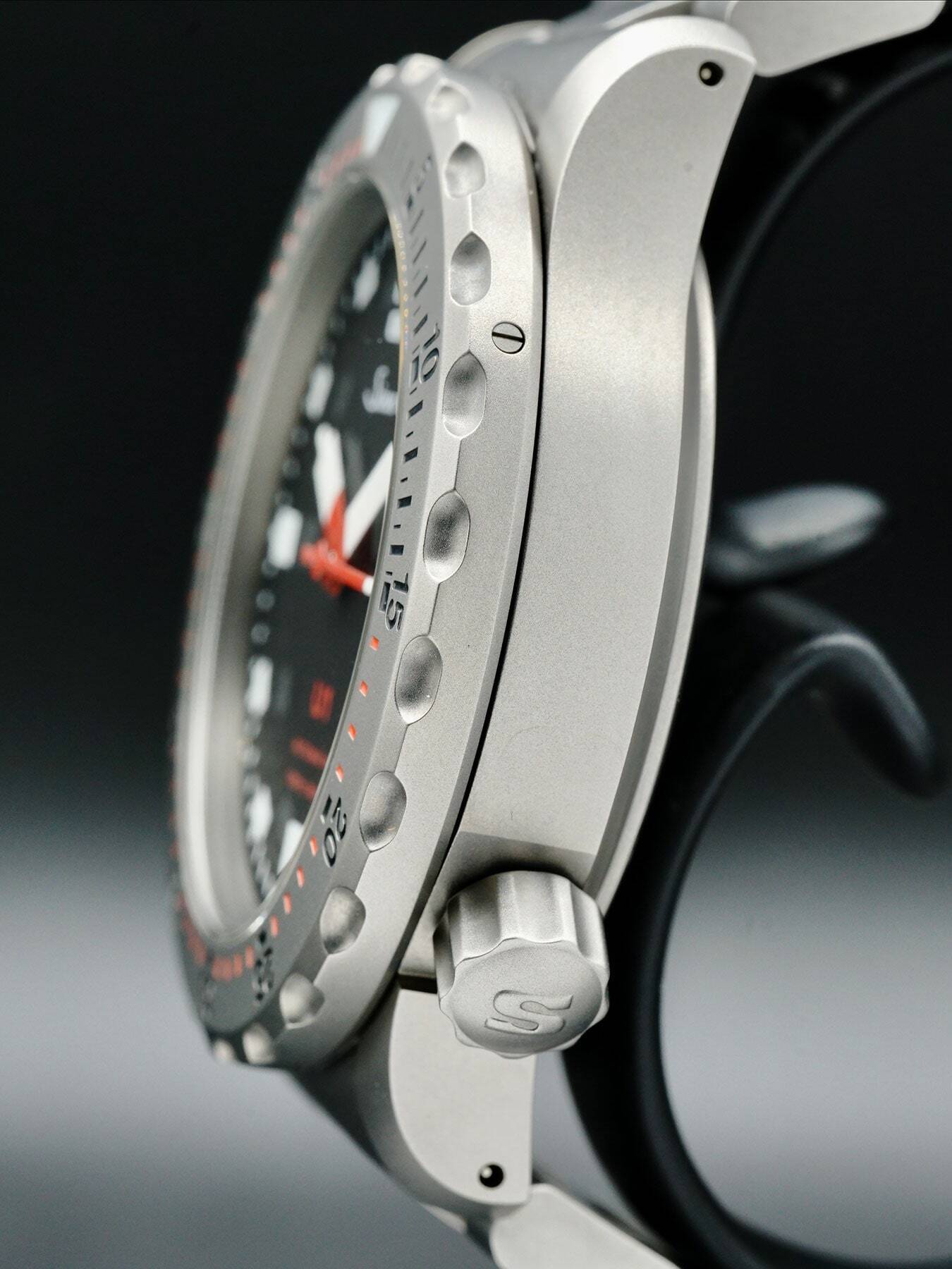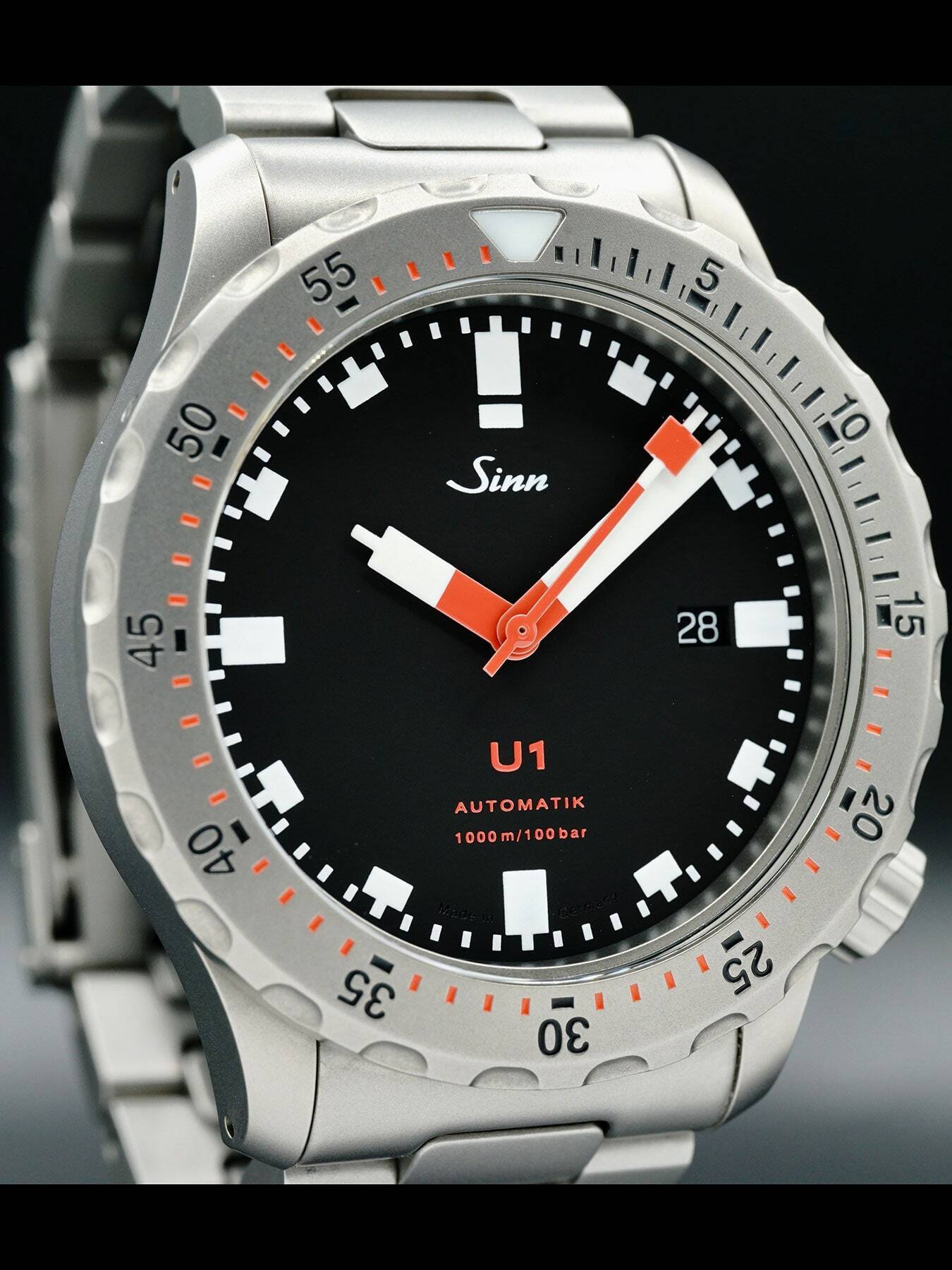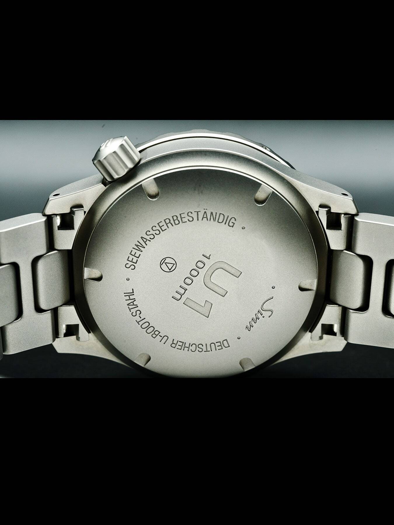 This Sinn Uhren Modell U1 features a 44mm German Submarine Steel case with a solid case back on a German Submarine Steel bracelet. This watch also sports a matte black dial with luminous hands and index dial markers covered by scratch resistant sapphire crystal.