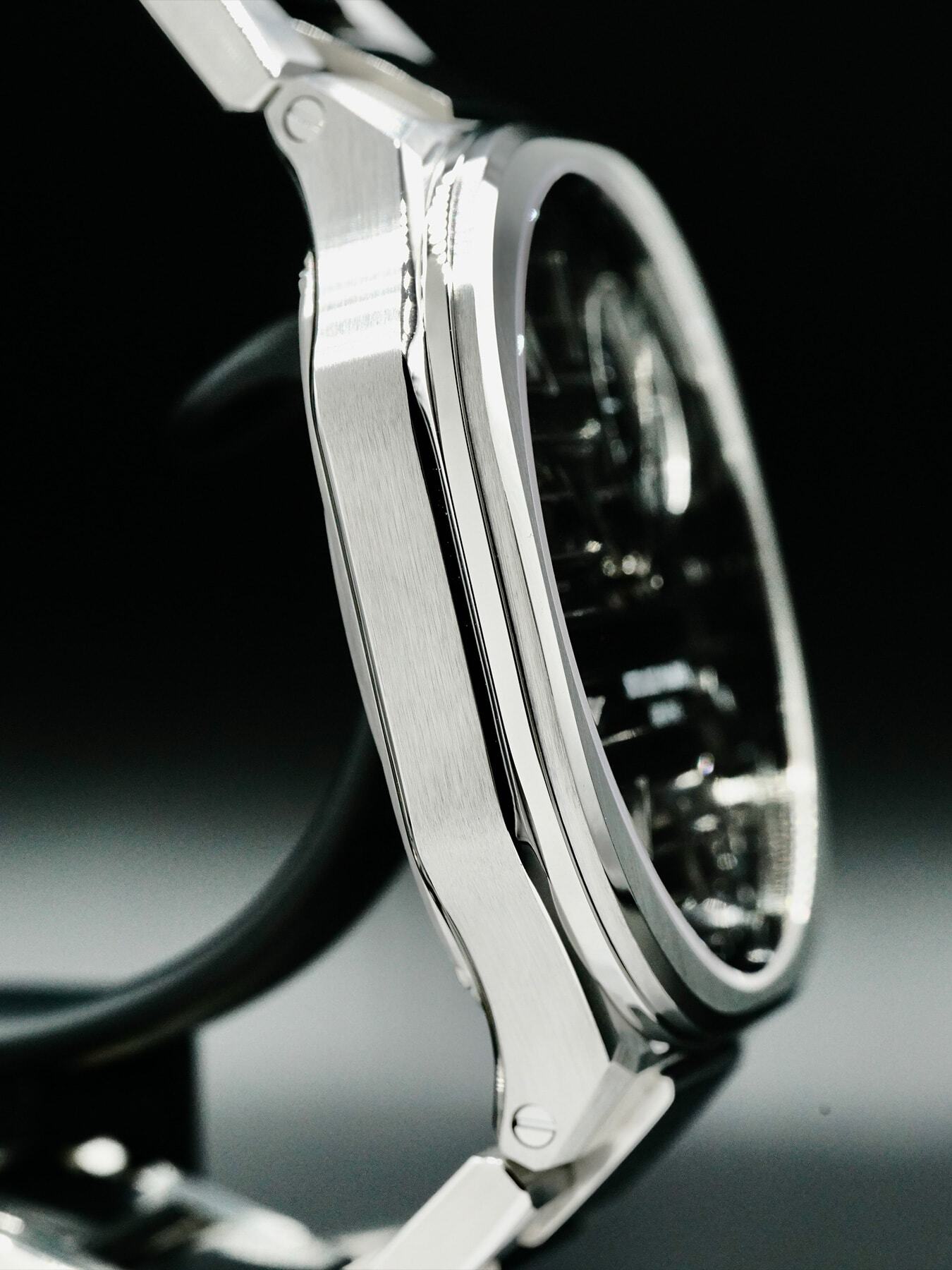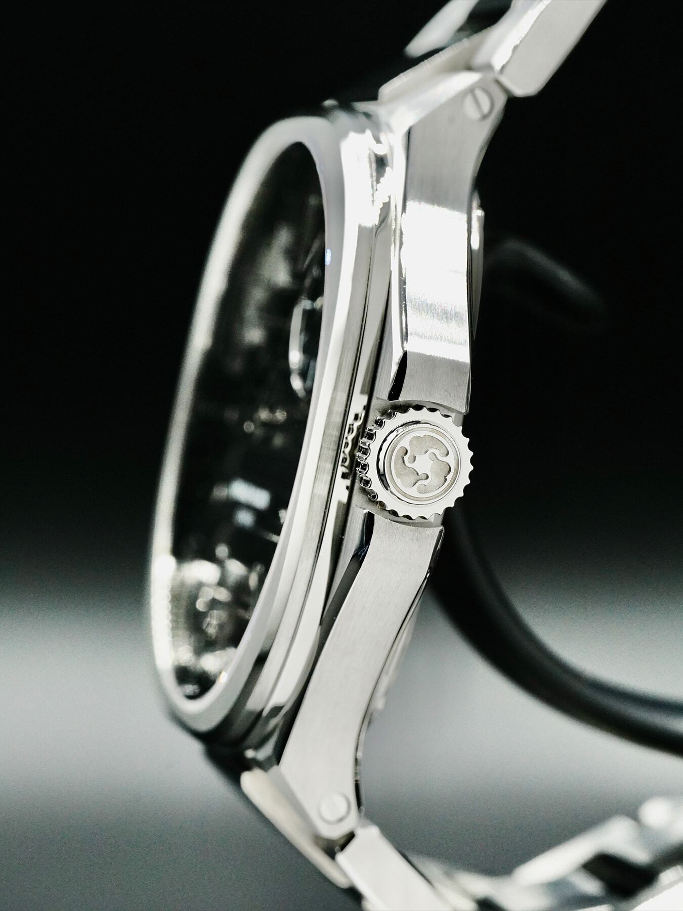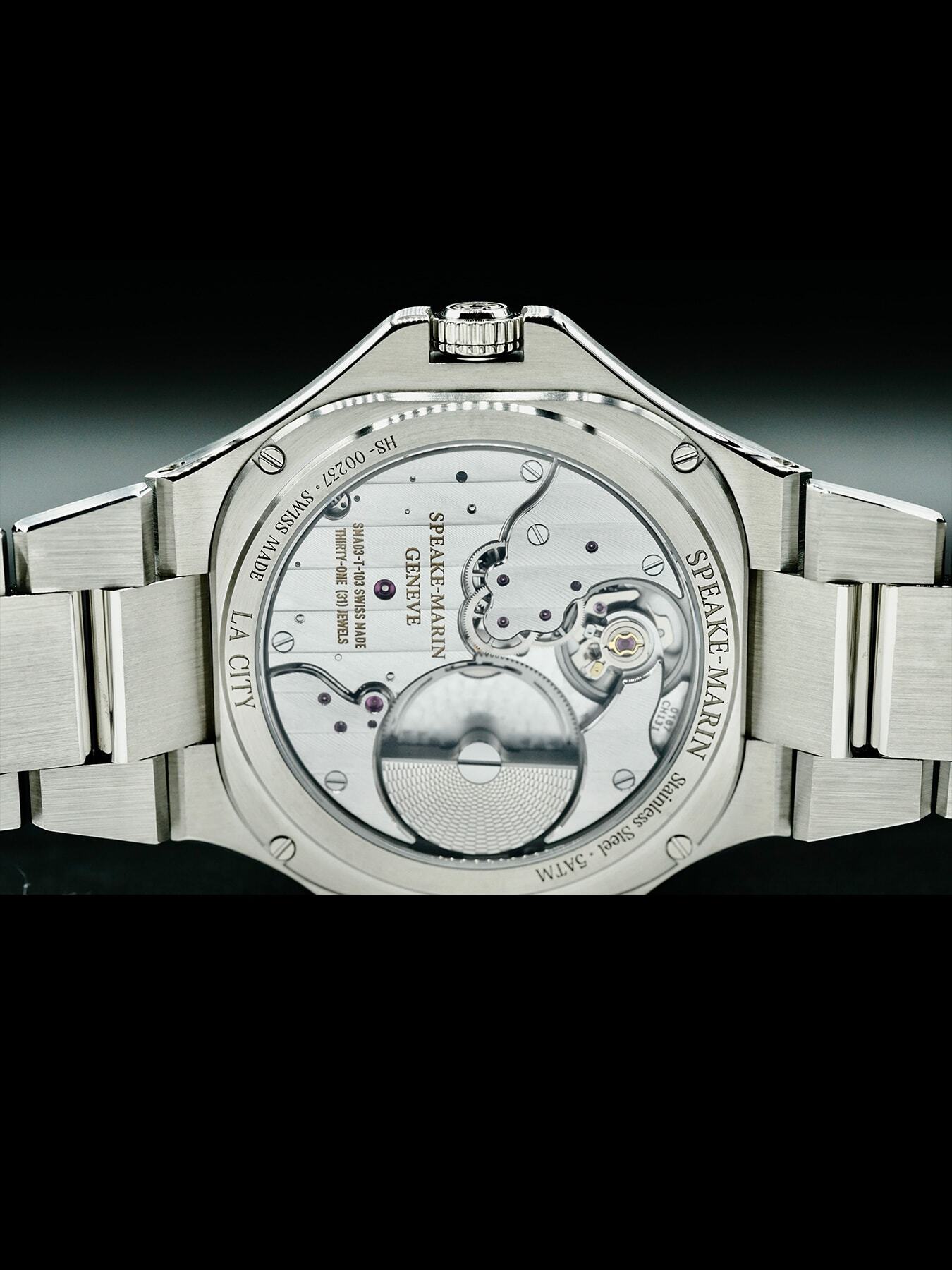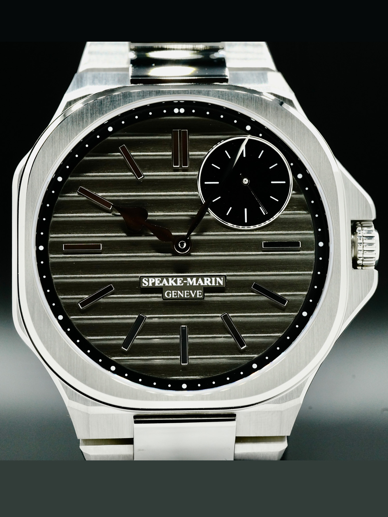 This Speake Marin Ripples features a 40.3mm new LA City case in stainless steel with an exhibition case back on an integrated stainless steel bracelet. This watch also sports a cool grey brushed dial with exclusive Ripples finishing covered by scratch resistant sapphire crystal.