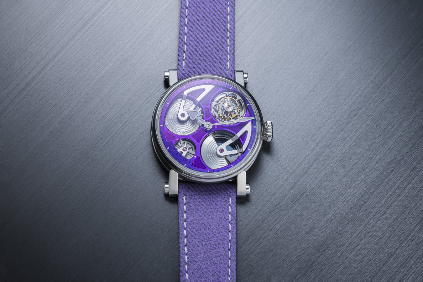 The timepiece’s captivating dial, comprising a two-layer plate with a satin finish and a positive purple