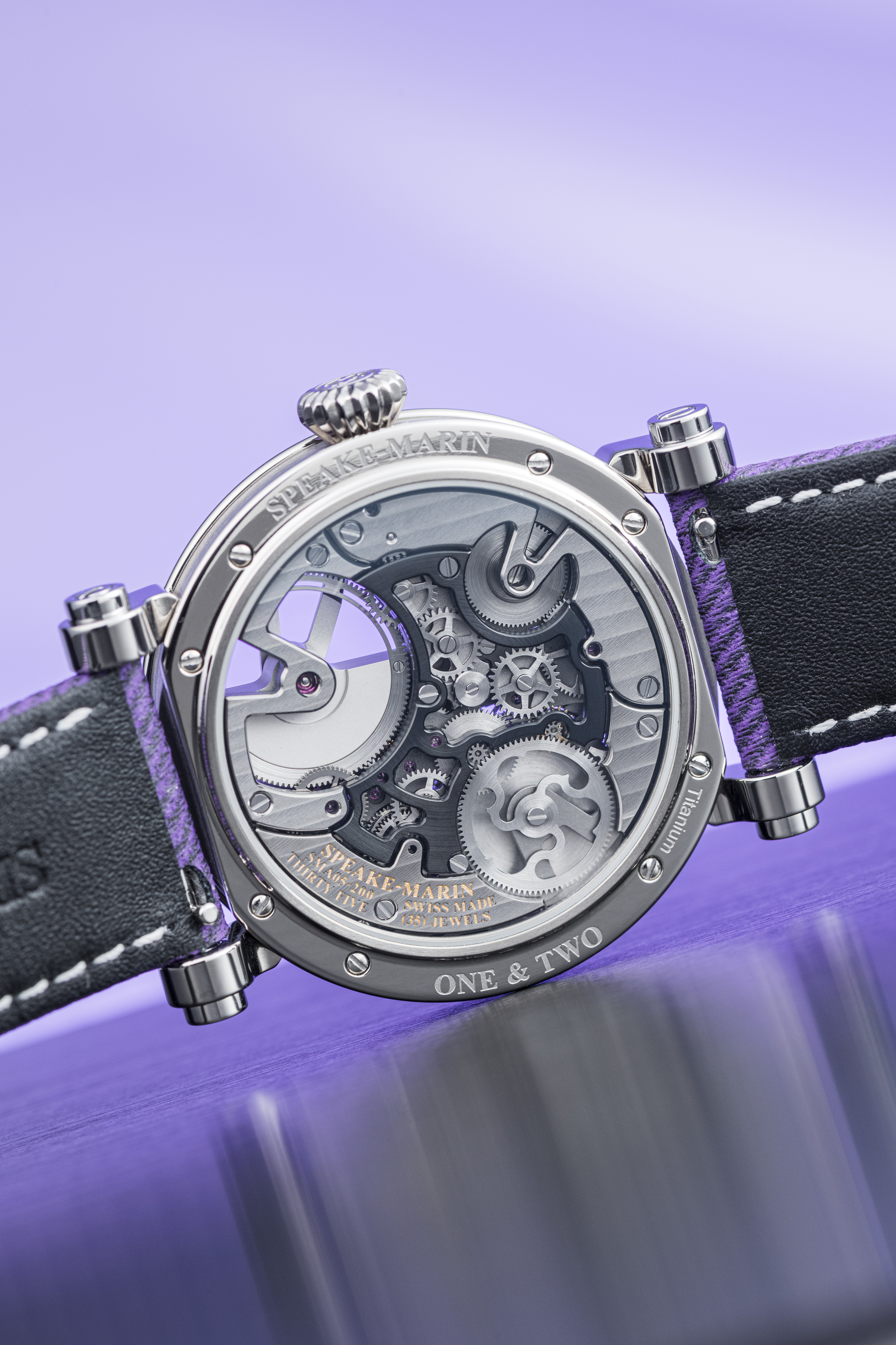 of Speake Marin powers the Openworked Tourbillon Purple Hour. It operates at a frequency of 3Hz (21,600 vibrations per hour) and provides a generous power reserve of 72 hours power from a single barrel. It is distinguished by its flying tourbillon mechanism at 1.30 o’clock: an unusual position that stands out as unique in the watchmaking panorama due to the difficulties of avoiding the time-setting module and a distinctive and recognised feature of the Maison.