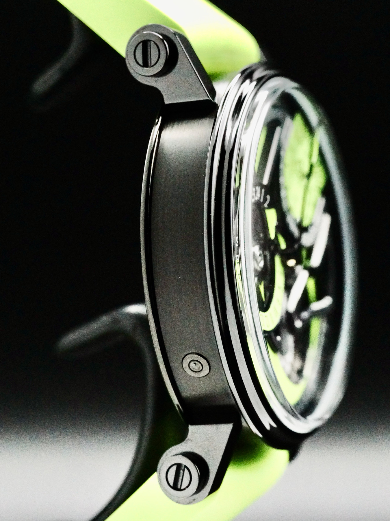 This Speake-Marin Dual Time Lime features a 38mm piccadilly case in black DLC-coated titanium with a display case back on a lime green rubber strap. This watch also sports a lime green dial with lime green lacquered hands and index dial markers covered by scratch resistant sapphire crystal.