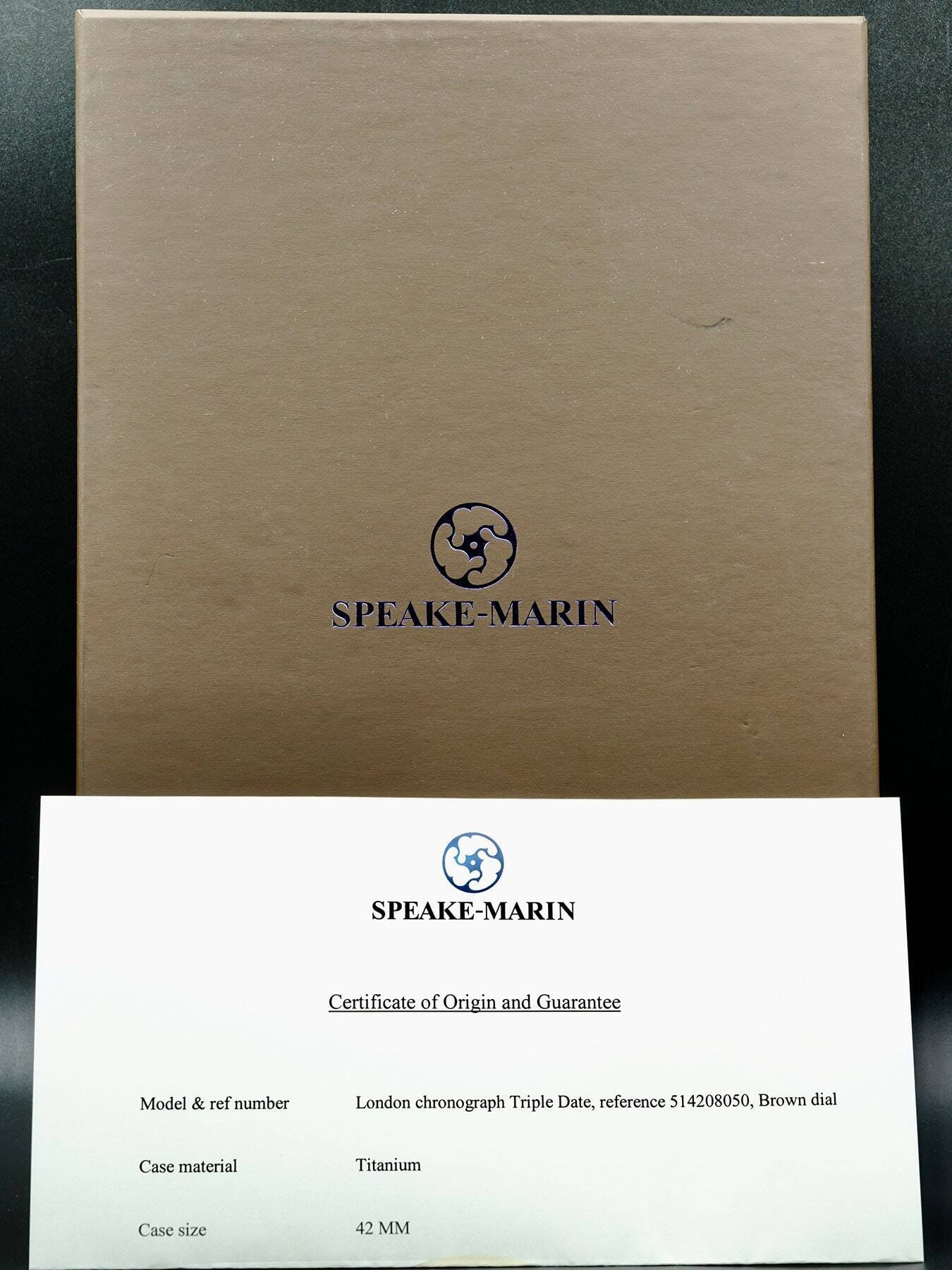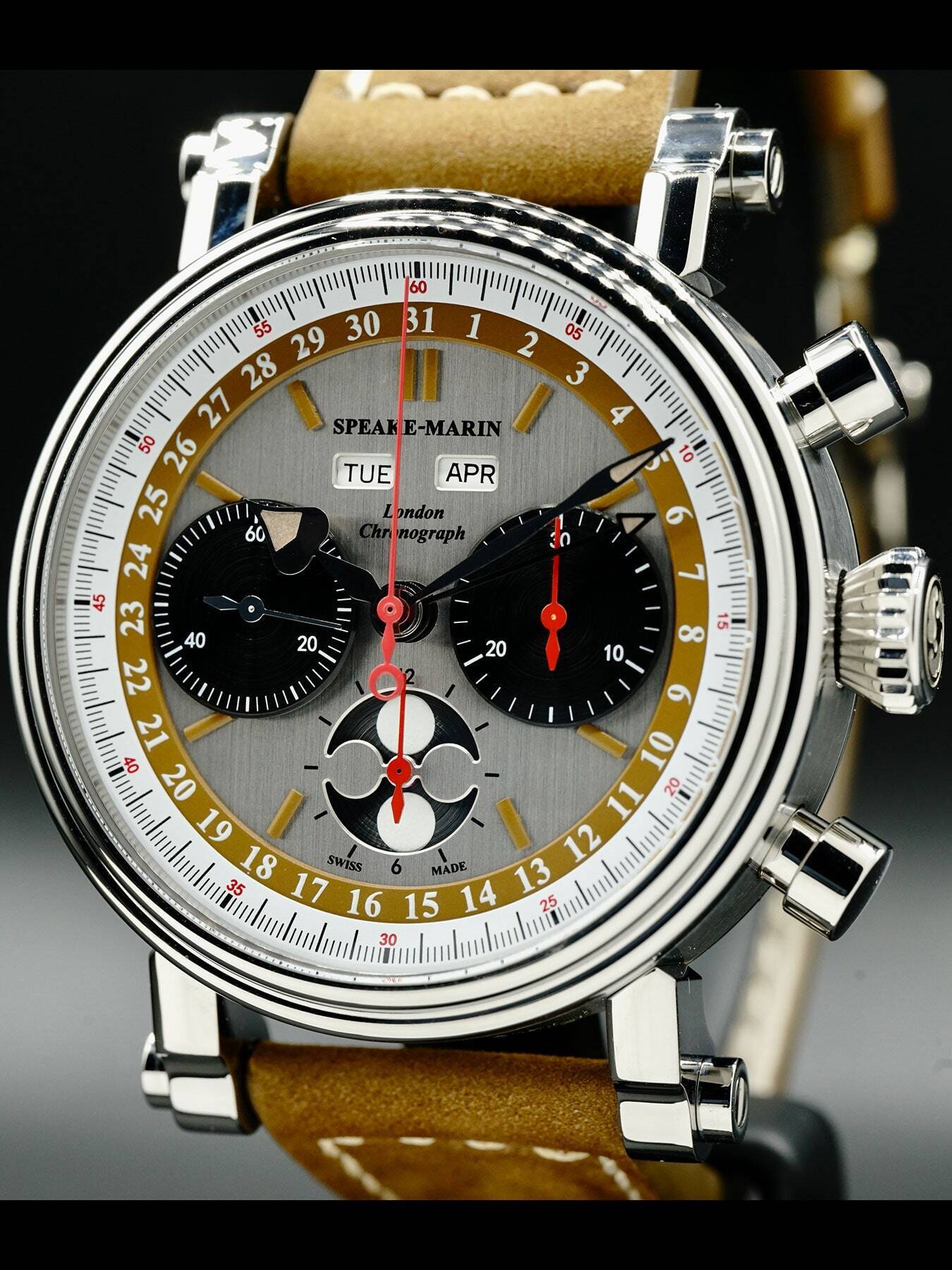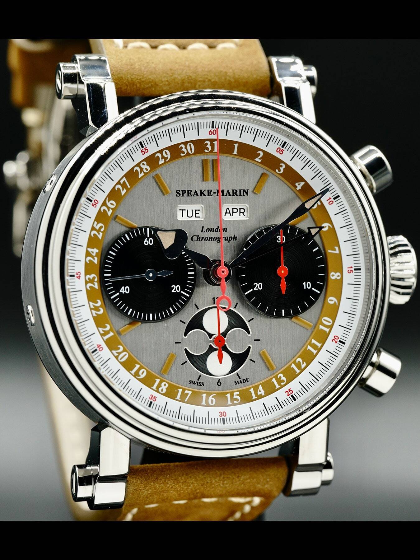 This Speake-Marin London Chronograph Triple Date 514208050 is in EXCELLENT condition. This watch includes its original box and Certificate of Origin and Guarantee dated for May 2022. Limited Edition of 15 pieces.