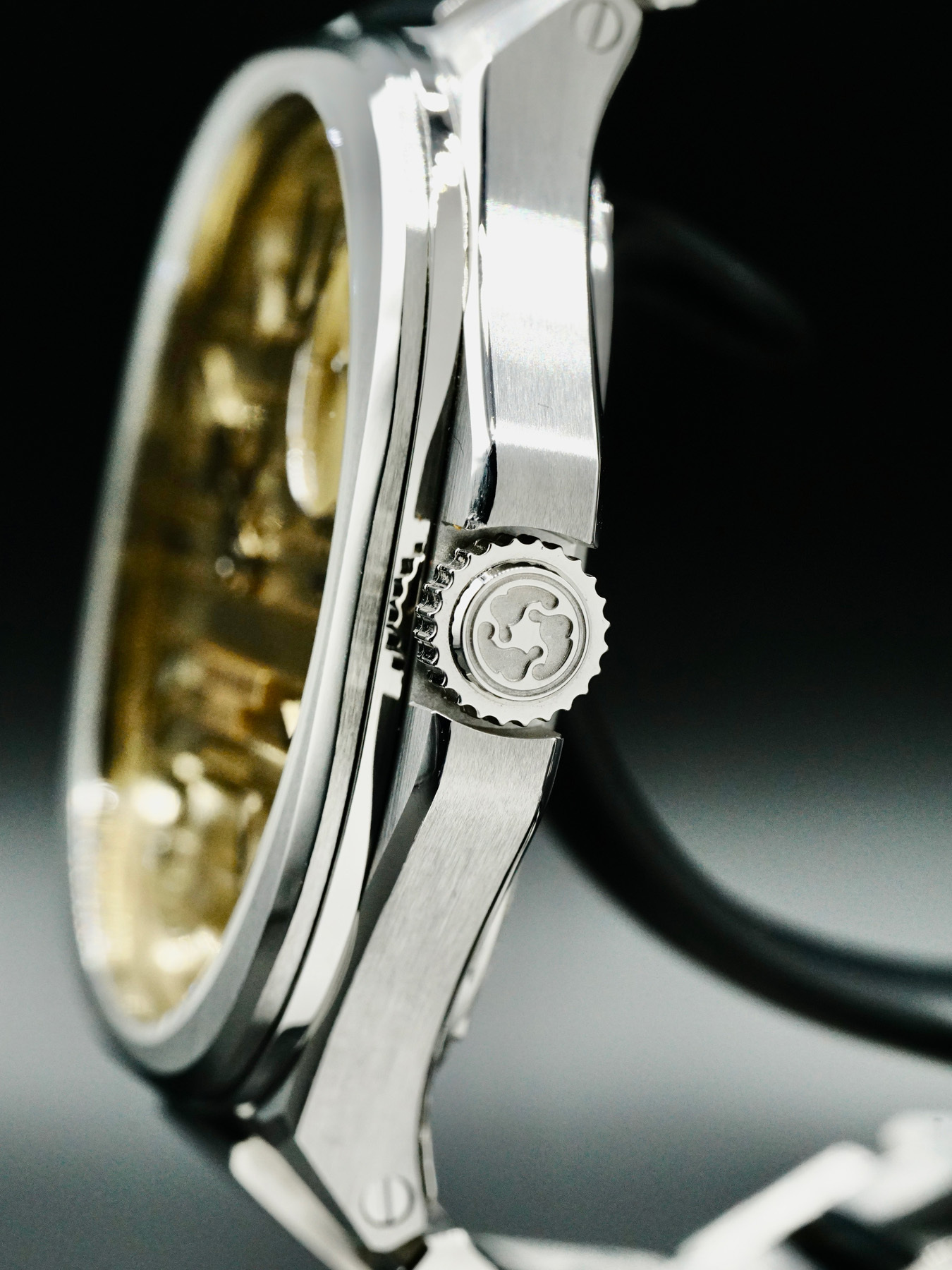 This Speake-Marin Ripples Anniversary features a 40mm stainless steel case with a display case back on an integrated stainless steel bracelet. This watch also showcases a solid gold dial with exclusive Ripples finishing covered by scratch resistant sapphire crystal.