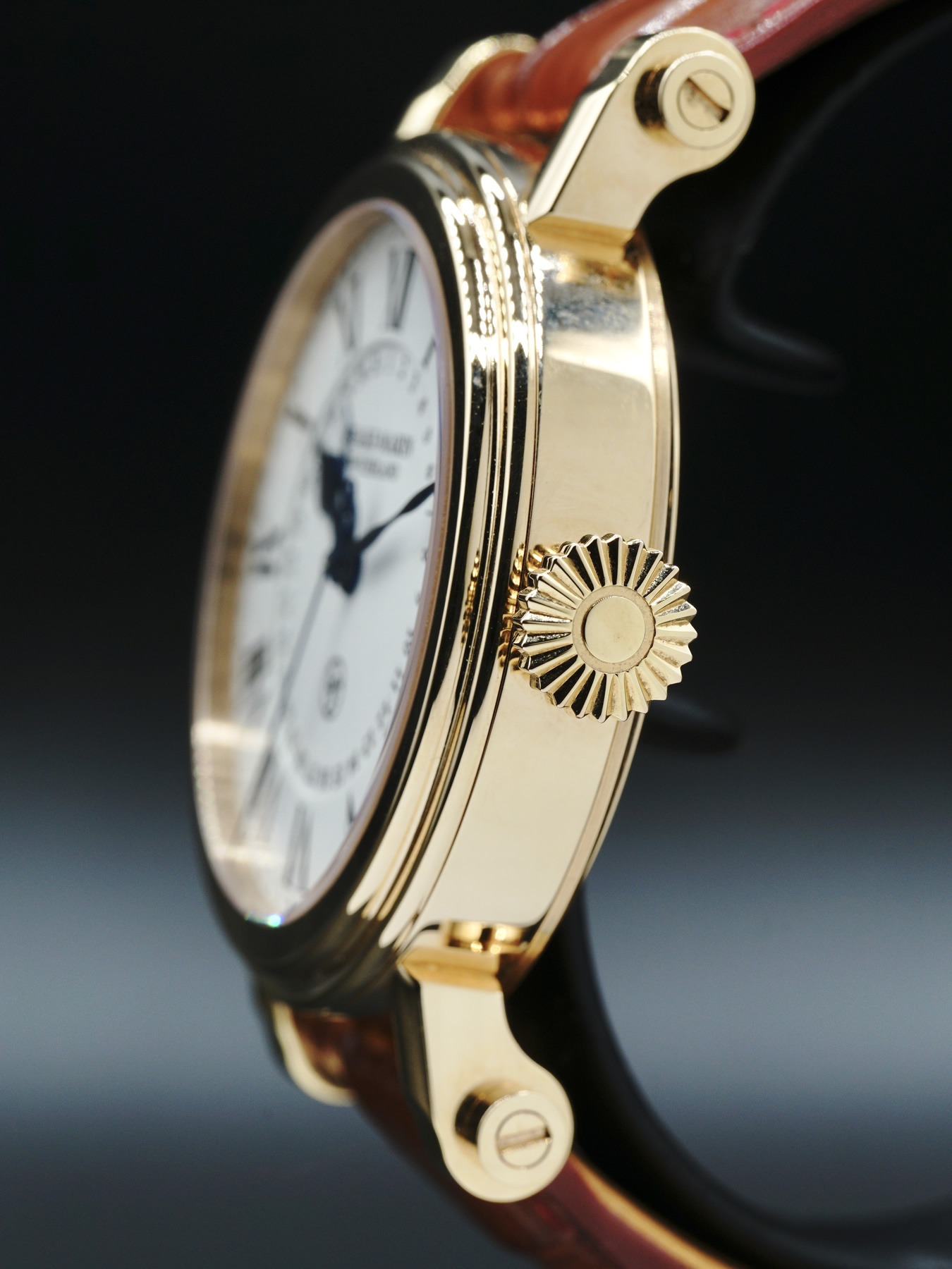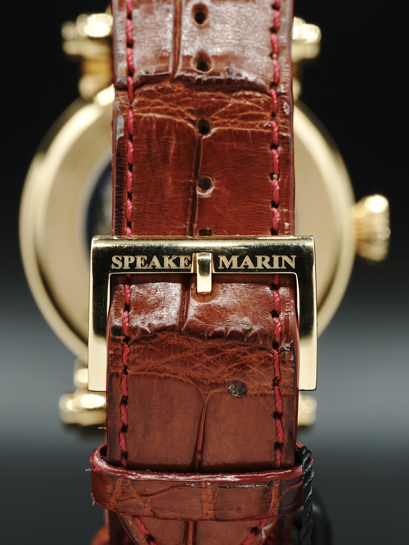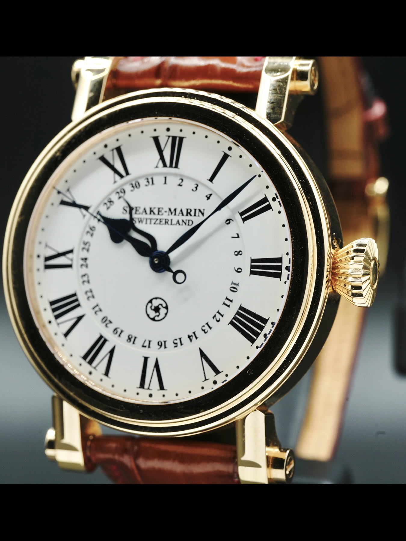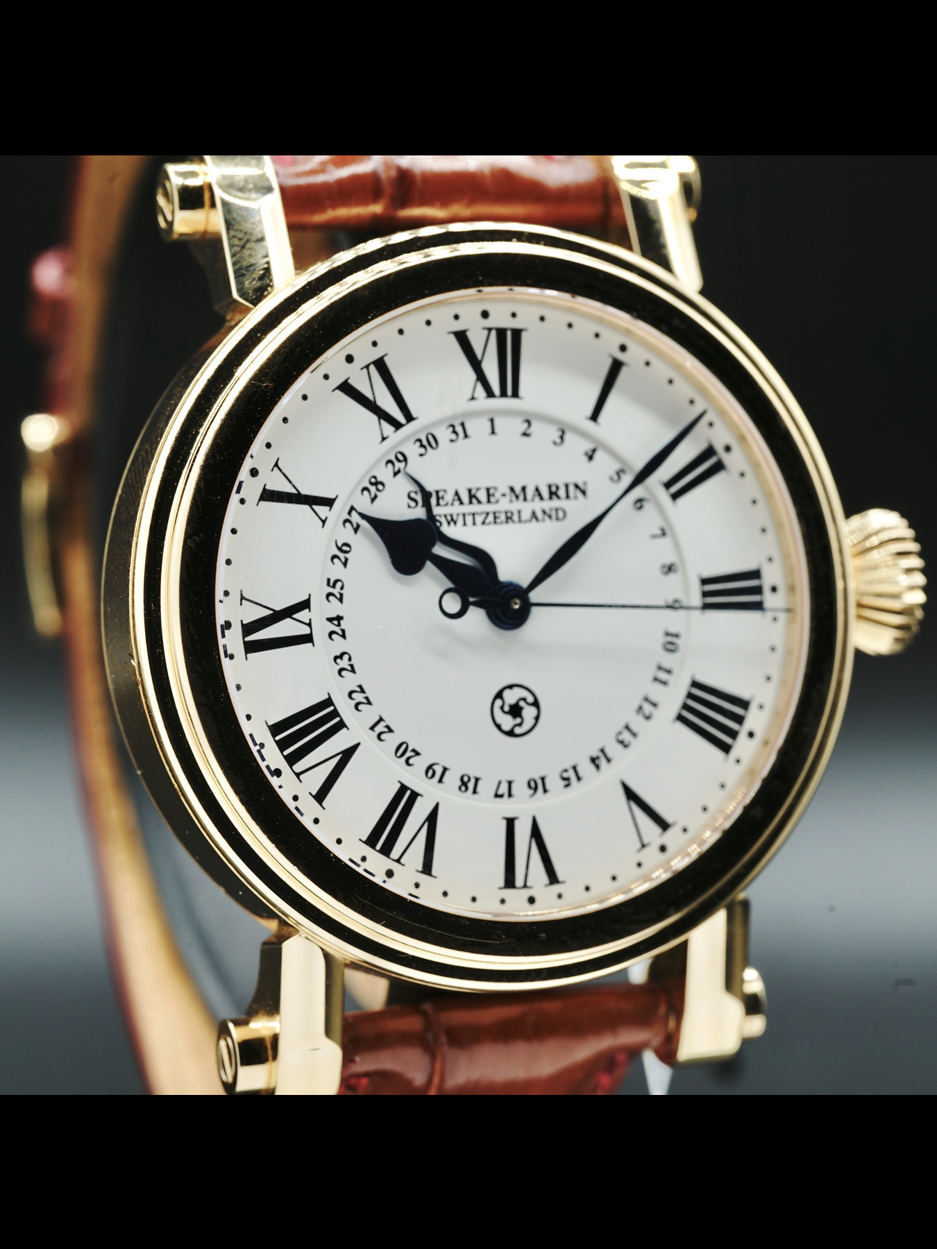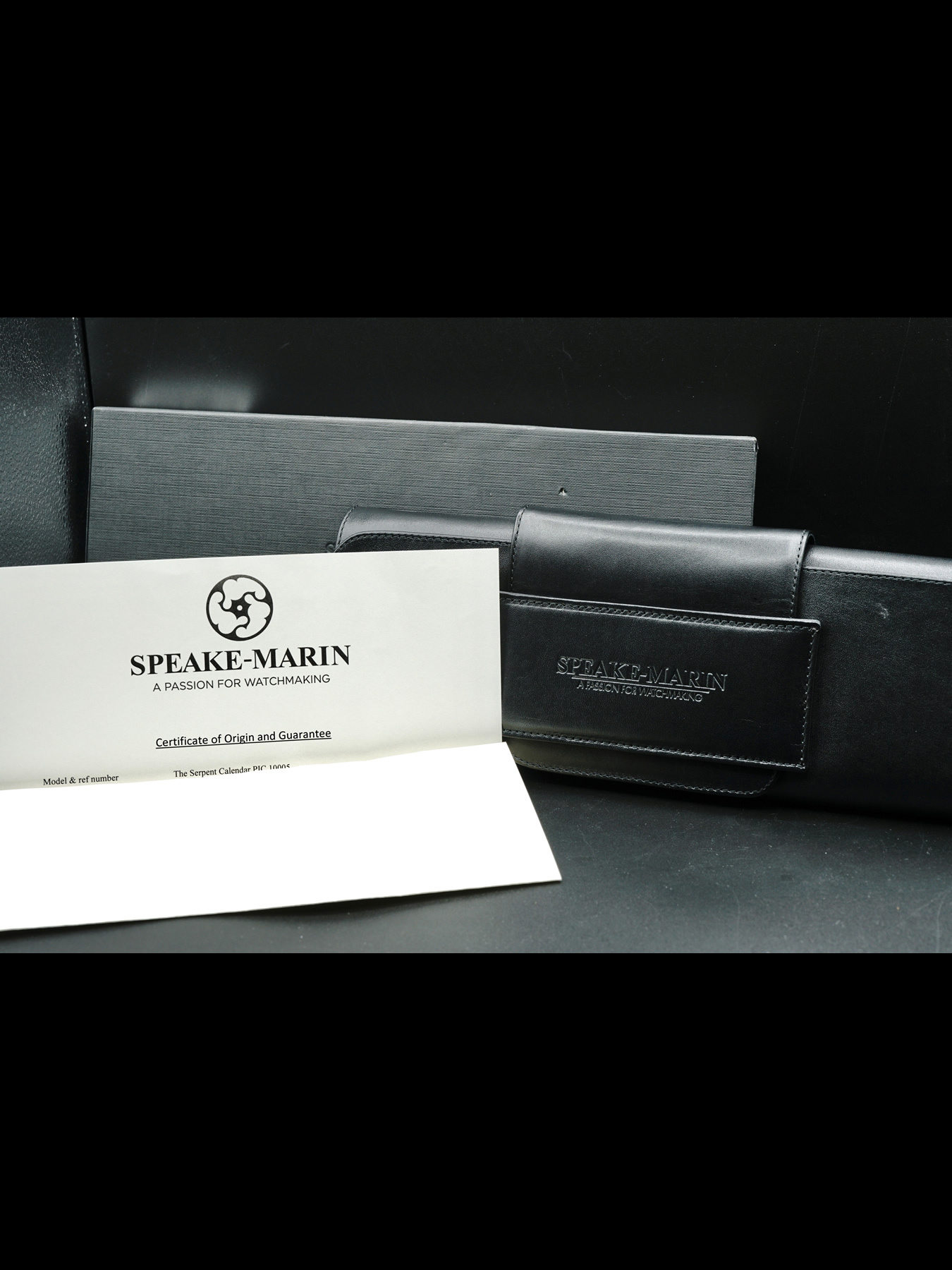 This Speake-Marin Serpent Calendar is in EXCELLENT condition. This watch includes its original box, certificate of origin and guarantee, and an extra alligator leather strap.