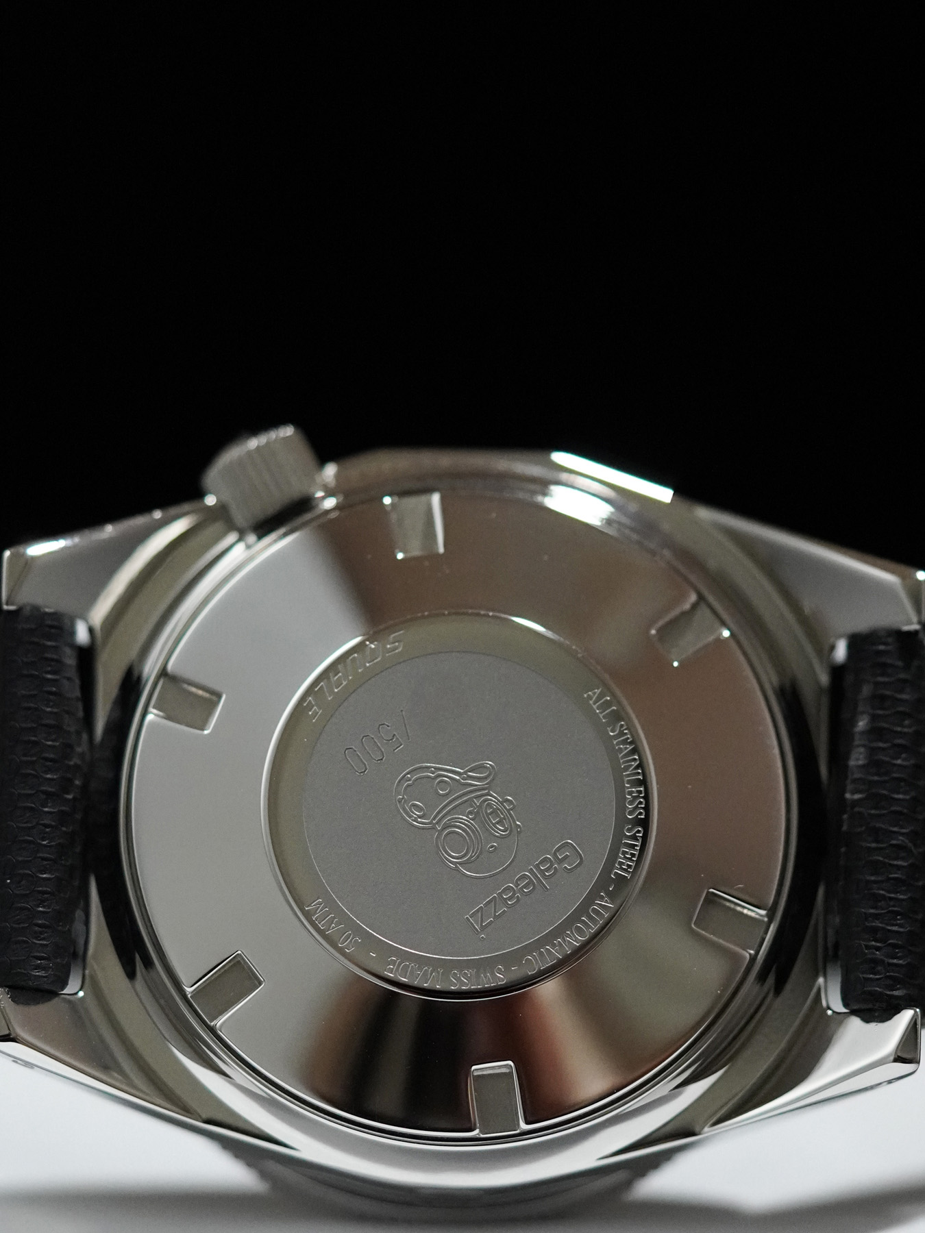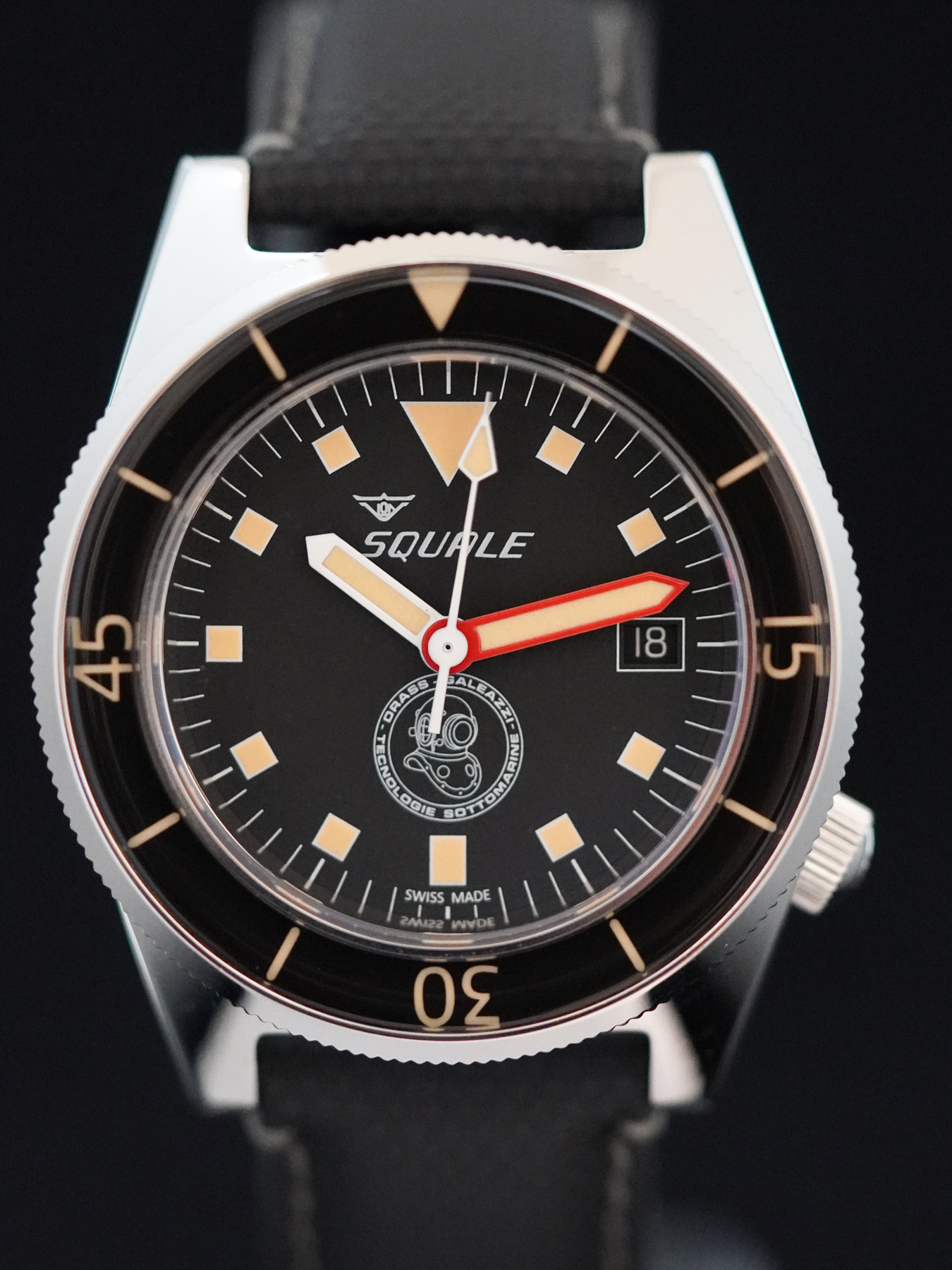 This watch features a 42mm stainless steel case on leather strap. This watch also sports a black dial. Powered by a Squale Calibre Sellita SW 200-1 movement. Water resistance up to 500 meters.