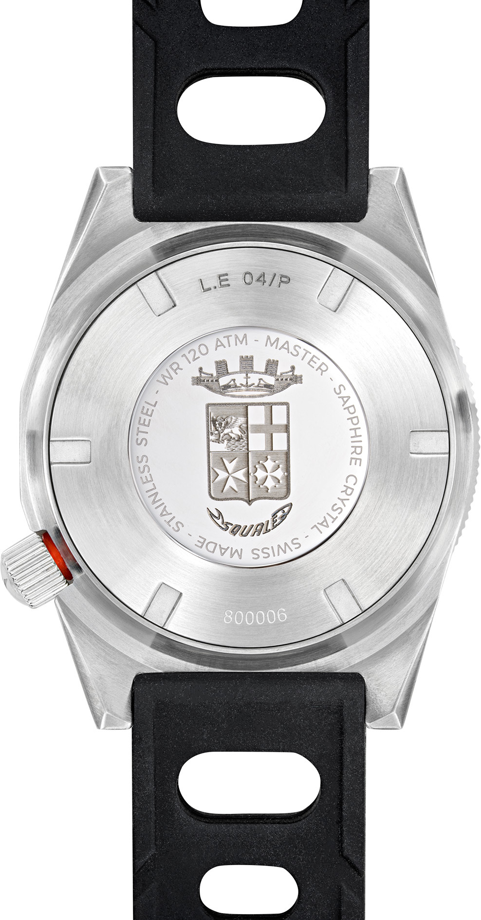 The caseback bears the Italian Navy coat of arms, depicting the four Maritime Republics, as well as the edition number of the limited series.