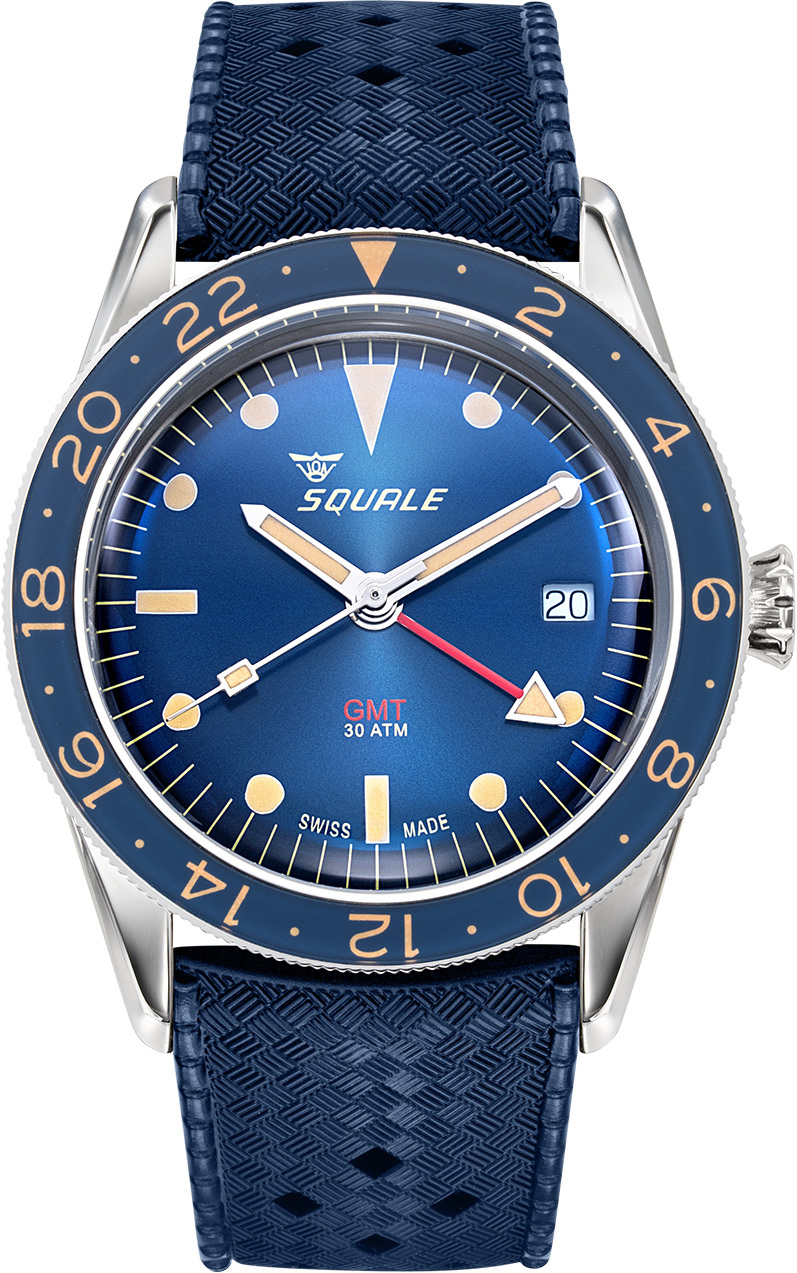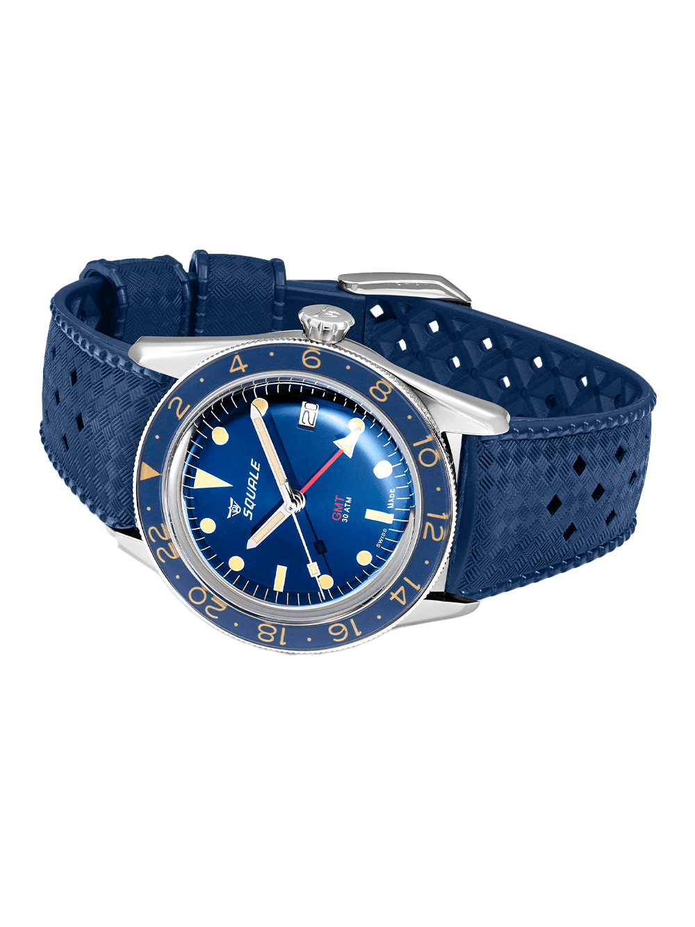 The Squale Sub 39 GMT Blue Edition on Strap features a 39mm steel case with a solid caseback. The crystal used is a Sapphire Crystal, which is able to be utilized in direct sunlight. The dial is a Blue. The hands are Luminous. The Squale Sub 39 GMT Blue Edition on Strap functions include Hours, Minutes, Seconds, Date, GMT and Rotating Bezel. Additionally, the SUB-39GMTBL.HTB is water resistant for up to 300m, so feel free to swim or even dive with it. The movement is Squale's Mechanical Automatic. The timepiece sports a rubber strap for ultimate comfort. The strap is finished with a pin buckle clasp. When purchasing this watch, you’ll receive a 2 Years warranty from Squale. The retail price for the Squale Sub 39 GMT Blue Edition on Strap is $1,560.00 USD. This watch is available for purchase at Exquisite Timepieces.
