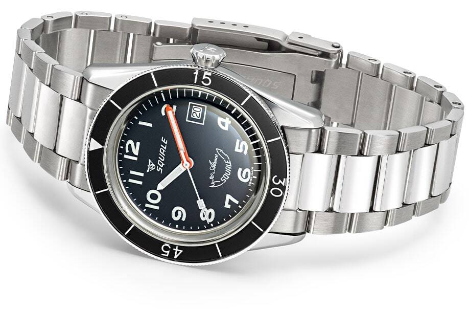 The Squale SUB-39 Black Arabic on Bracelet SUB-39MON.BR22 features a steel with a Screw-In-Caseback. It's case is 12 mm thick. The crystal used is a sapphire crystal, which is able to be utilized in direct sunlight. The dial is Black. The hands are Luminous. The Squale SUB-39 Black Arabic on Bracelet SUB-39MON.BR22 functions include hours, minutes, seconds and date. Additionally, the SUB-39MON.BR22 is water resistant for up to 300 m, so feel free to swim or even dive with it. The movement is Sellita SW 200-1 Automatic. The timepiece sports a Stainless Steel strap for ultimate comfort. The strap is finished with a deployant clasp. When purchasing this watch, you’ll receive a 2 Years warranty from Squale. The retail price for the Squale SUB-39 Black Arabic on Bracelet SUB-39MON.BR22 is 1465 USD. This watch is available for purchase at Exquisite Timepieces