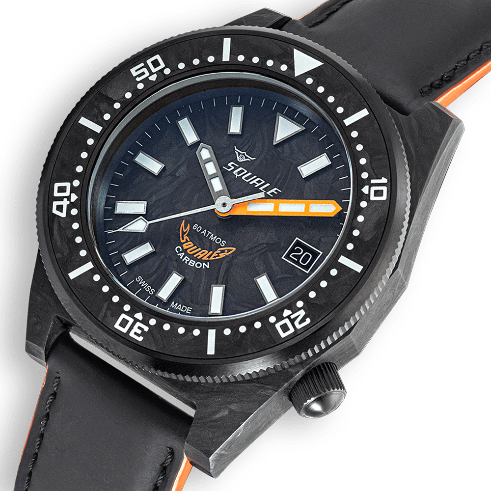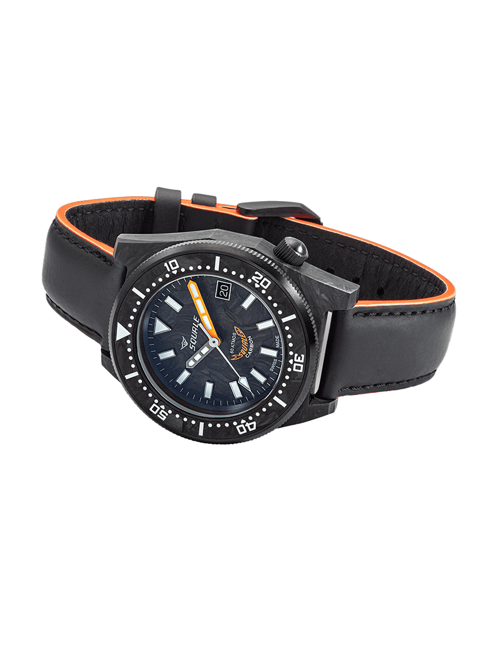 - This timepiece features a 42mm carbon and steel case paired with a high quality rubber strap. It showcases a distinctive black and orange dial and is powered by a precise automatic winding movement. The watch is designed with a water resistance of up to 600m.