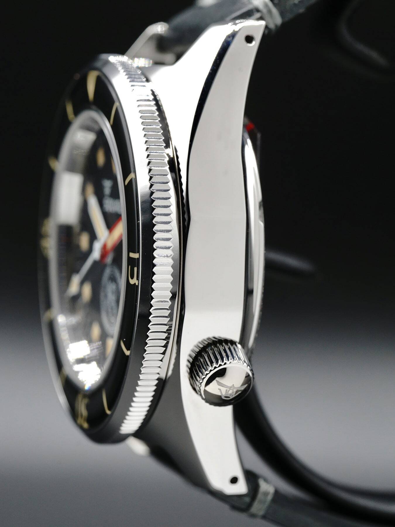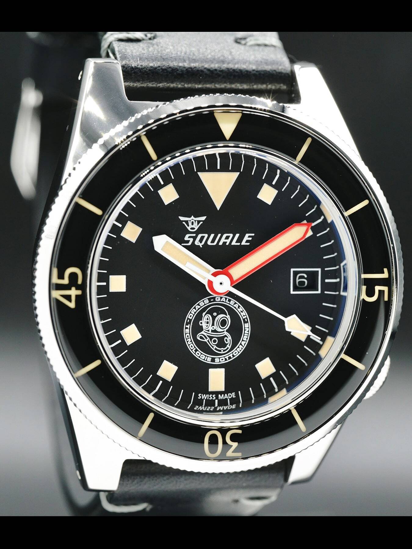 This Squale Galeazzi features a 42mm polished stainless steel case with a solid case back on a black leather strap. This watch also showcases a black dial with luminous hands and dial markers covered by anti-reflective, scratch-resistant sapphire crystal.