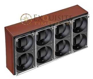 The Swiss Kubik 8 Winder Watch Winder - Natural Calf Leather with White Stitches is crafted in a luxurious handmade leather housing embellished with saddle style stitching and features an optional polished acrylic window protector.